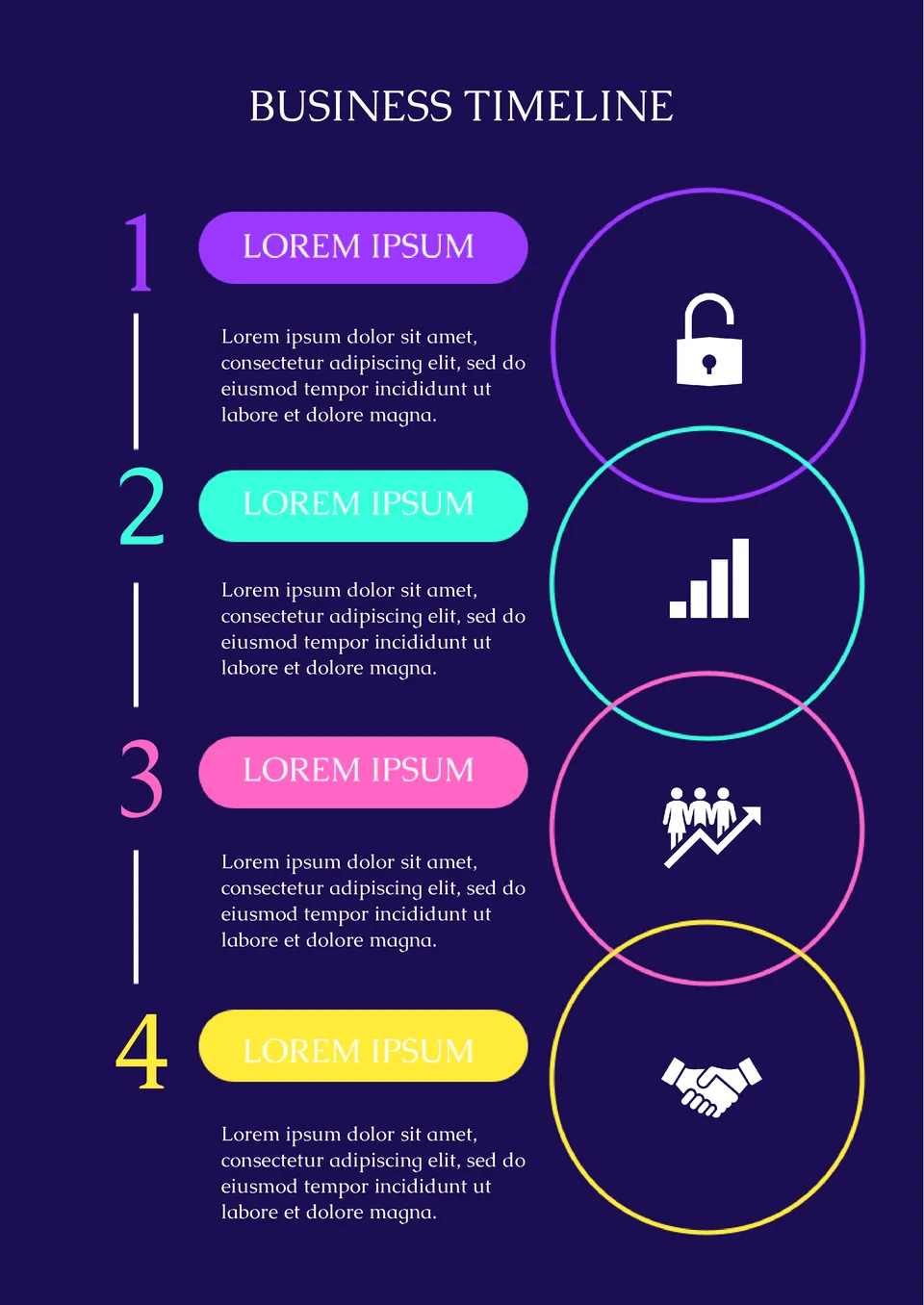 Usa la plantilla de línea de tiempo empresarial en Google Docs para una breve presentación de un plan de negocios o ilustración de la rentabilidad de un futuro acuerdo. El diseño está hecho por diseñadores profesionales de tal manera que puedas detallar todas las etapas de tu plan: desde el punto de partida hasta el resultado final. Edita la plantilla de línea de tiempo y distribuye tu propuesta a inversores y socios.