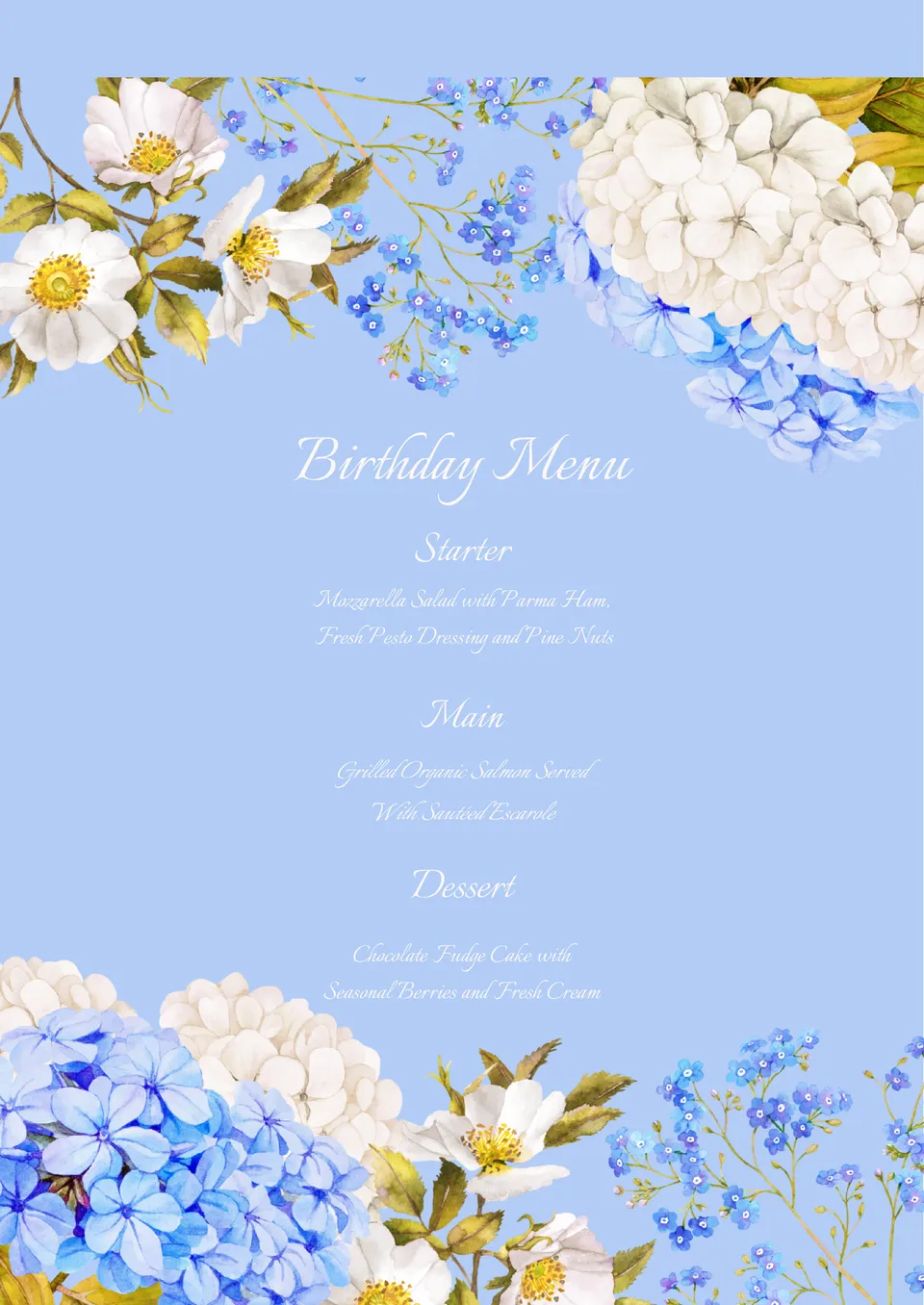 Esta pintoresca plantilla te resultará útil a la hora de crear un menú de cumpleaños temático. El delicado fondo azul y las imágenes de flores atraerán tanto a los invitados como a la persona que cumple años. En el centro de la hoja, se enumeran en una columna los aperitivos, los platos principales y los postres. Si es necesario, puedes añadir fácilmente otras categorías mientras editas la plantilla en Google Docs. El diseño se puede utilizar tanto para organizar una celebración personal como para fines comerciales.