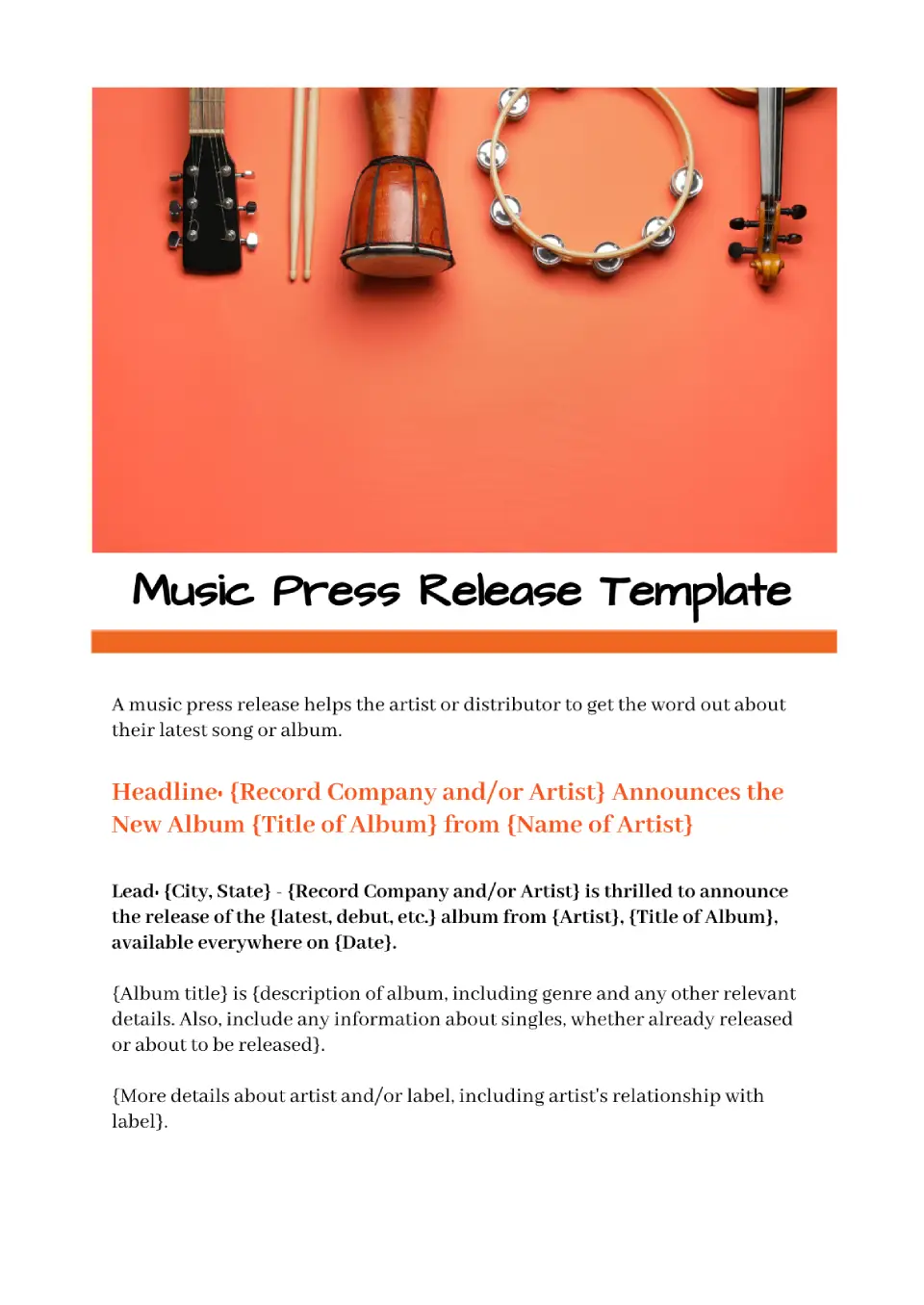 Obtén una colorida plantilla de comunicado de prensa de música en Google Docs de forma gratuita que captará la atención de los lectores y aumentará las ventas. Edita e imprime el diseño para la presentación de tu álbum de música. Indica en la plantilla de comunicado de prensa cuándo estarán disponibles las nuevas canciones. Descarga una maqueta gratuita, agrega la foto más famosa del artista y obtén una gran demanda de productos musicales.