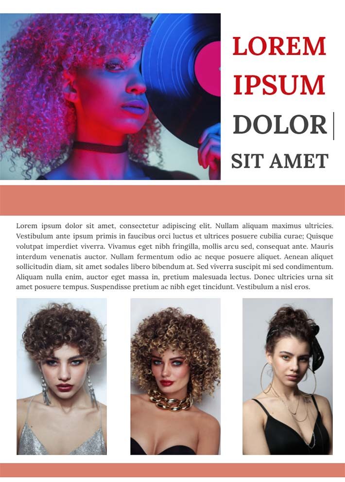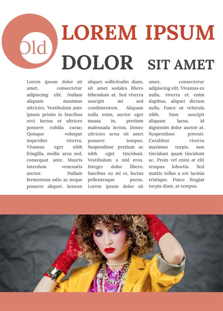 Este diseño está hecho en el estilo de las mejores revistas de moda brillantes de los años 80. Todas las páginas de la plantilla se superponen entre sí debido al uso de una misma gama de colores. La plantilla de Google Docs para revistas utiliza bloques de texto de diferentes formatos. De este modo, puedes colocar breves descripciones de las tendencias de moda en la página principal y usar columnas periodísticas en la última página de la plantilla para un artículo de relaciones públicas, informativo o comercial.