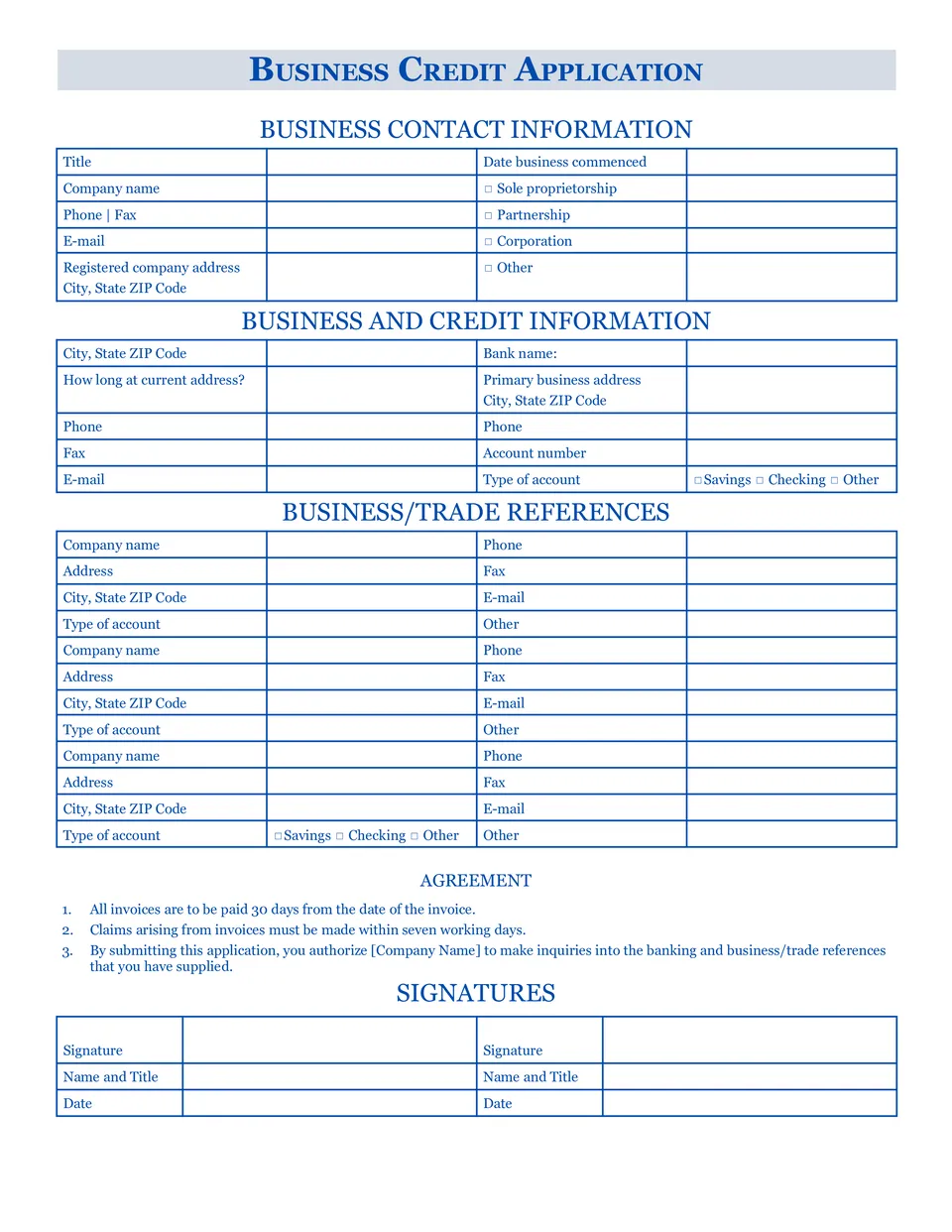 Descarga la plantilla de solicitud de crédito empresarial en Google Docs para obtener un préstamo para tu negocio. El diseño contiene toda la información necesaria que las organizaciones financieras suelen requerir. Con su ayuda, la institución de crédito evaluará rápidamente las capacidades del negocio y tus objetivos. Usa la plantilla de solicitud gratuita e imprimible que demostrará tu solvencia.