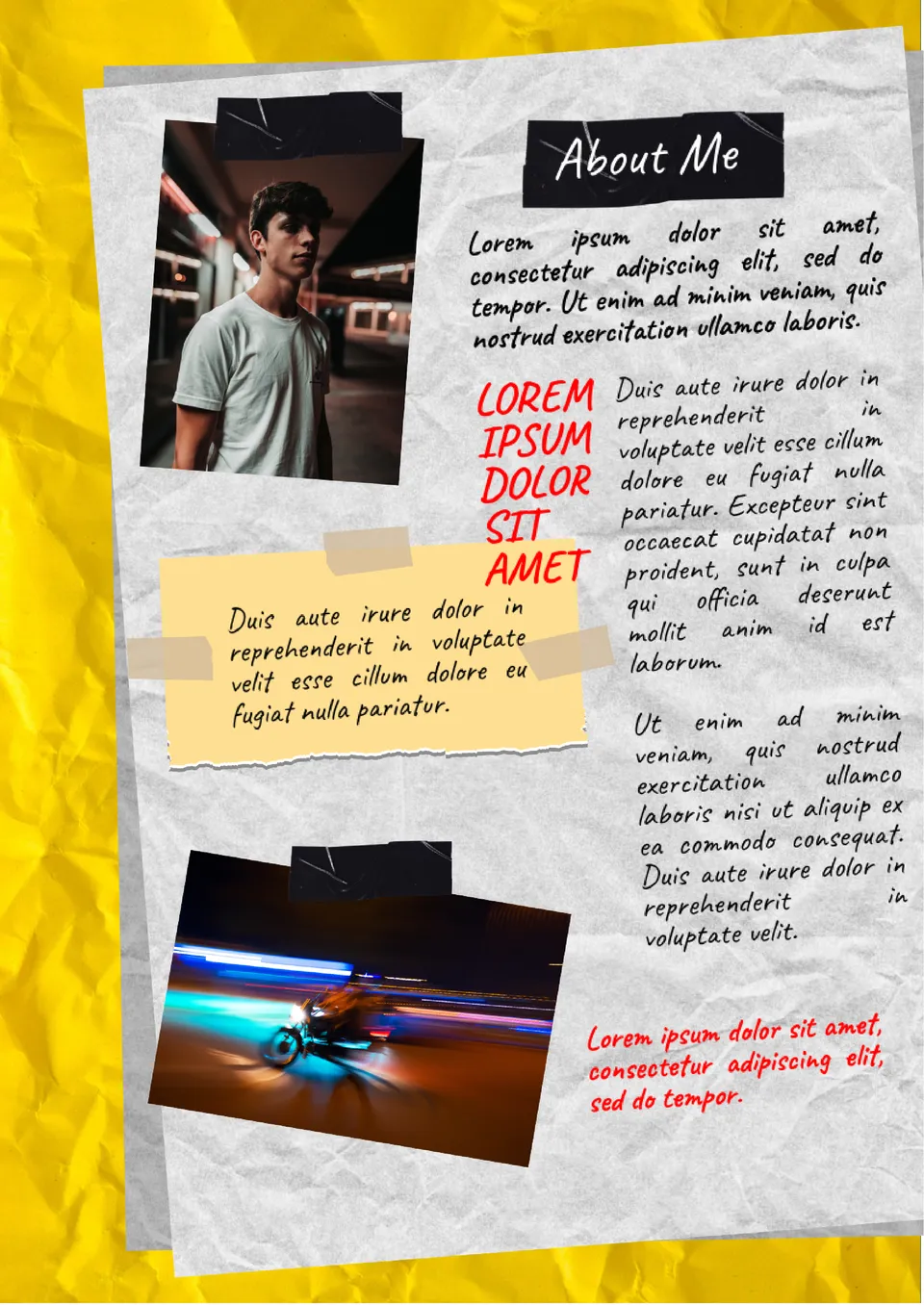 Tell us about yourself in an original way using a template stylized as a piece of crumpled paper. After filling it out, you can publish it on your social media pages, your own website, and any other resources. Your rectangular photo is placed on the left, and there is space for another photo below. The text is written in the column on the right. In the central part of the book template, there is a "note" where you should add the information you want to draw attention to.