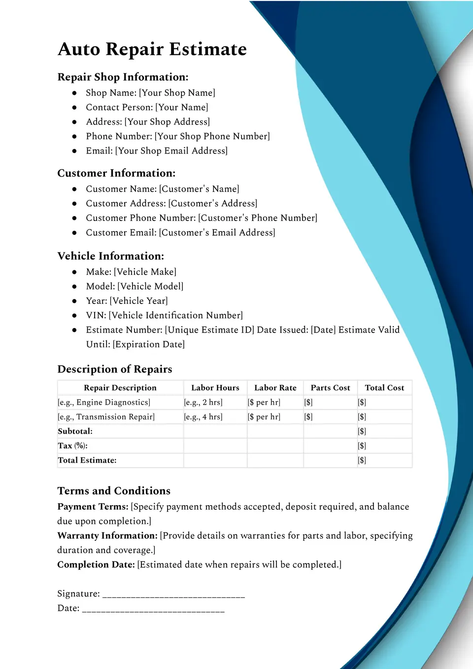Looking to provide clients with clear and organized repair estimates? Our Home Repair Estimate Template offers a structured format to detail repair tasks, associated costs, and timelines.