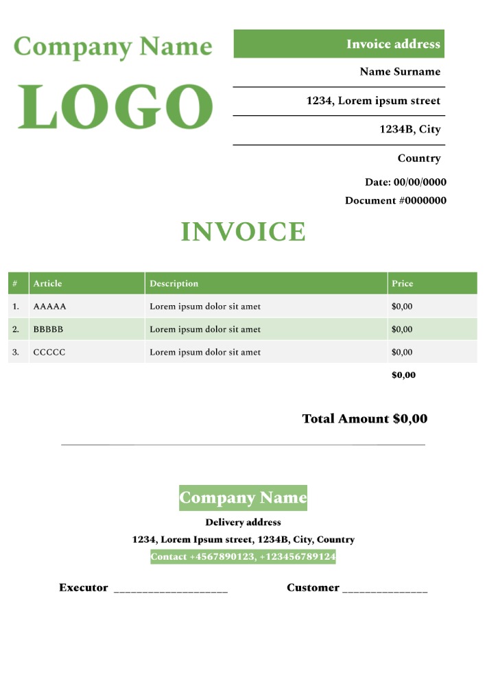 Do you need a business invoice or a personal invoice? You can adapt this Google Docs template for any task. Working in Google docs, all changes in the template are automatically saved, if necessary, you can update to restore any version of the document. This template is compatible with Microsoft Word.