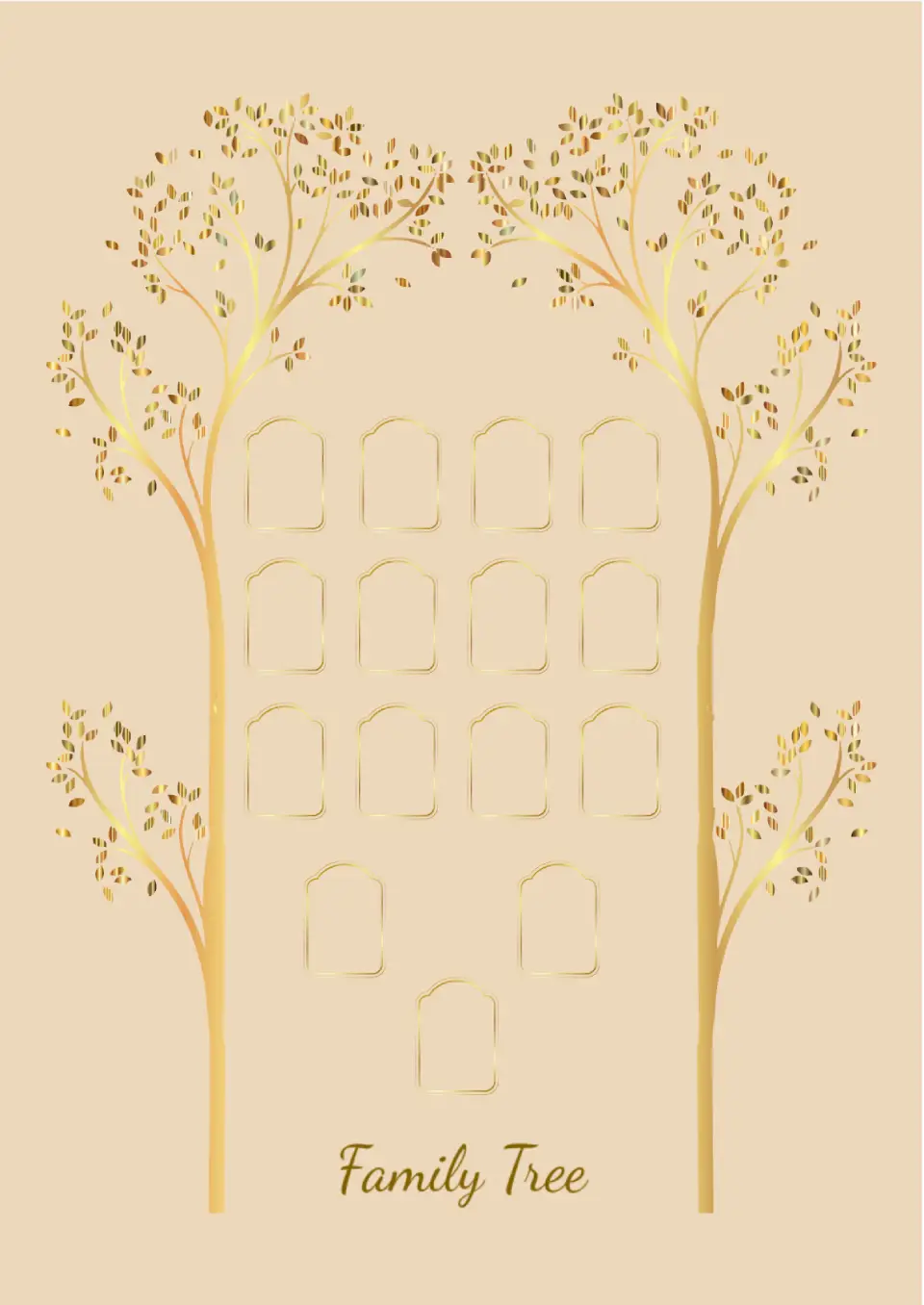 The template has a unique design: two elegant golden trees are placed on the sides, forming a frame. Inside it are slots where relatives' photos or textual information about them can be added. If desired, during the editing process, you can manually trace family ties. The Blank Family Tree Template for Google Docs can be filled out both online and in printed form.