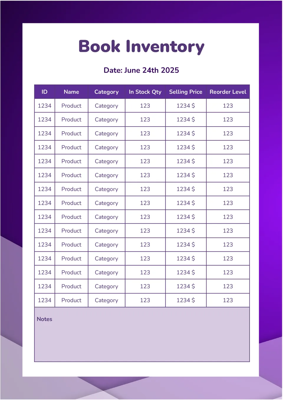 With this useful editable template, you can easily conduct scheduled inventories. The page looks like a table divided into 6 columns: Product ID, name, category, available quantity, selling price, and reorder level. All you have to do is enter the actual data by filling in the templates in Google Docs or by hand. If you don't like the purple and white color scheme of the layout, you can change it during editing.