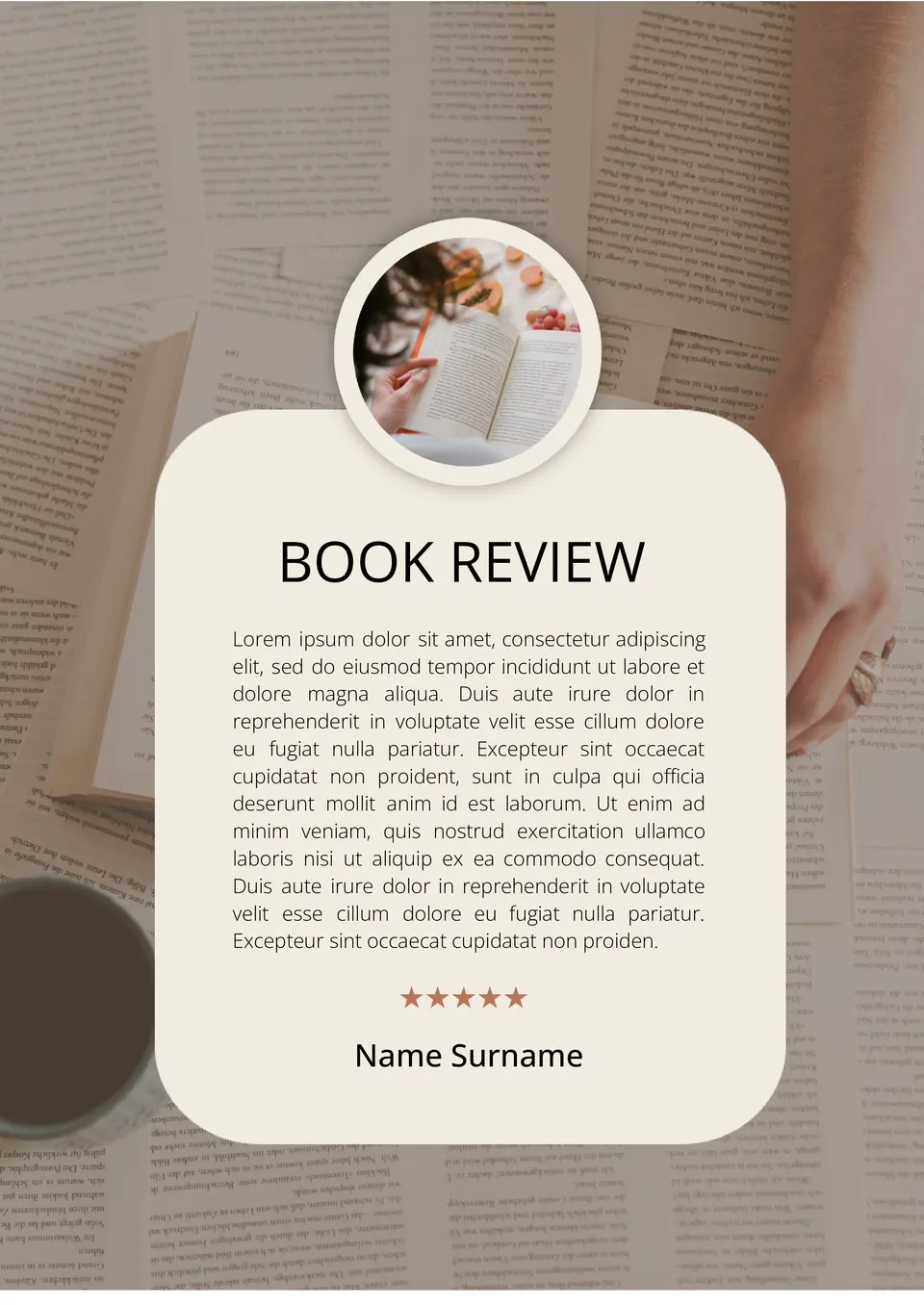Write down your impressions of a literary work in a stylish Book Review Template for Google Docs. After adding the text of the review, leave 1 to 5 stars below it to rate the book. Once you start keeping such records, you will be able to recall the essence of a work at any time. It is convenient to share completed books templates with friends by linking to the file on Google Drive or publishing it on the Internet.