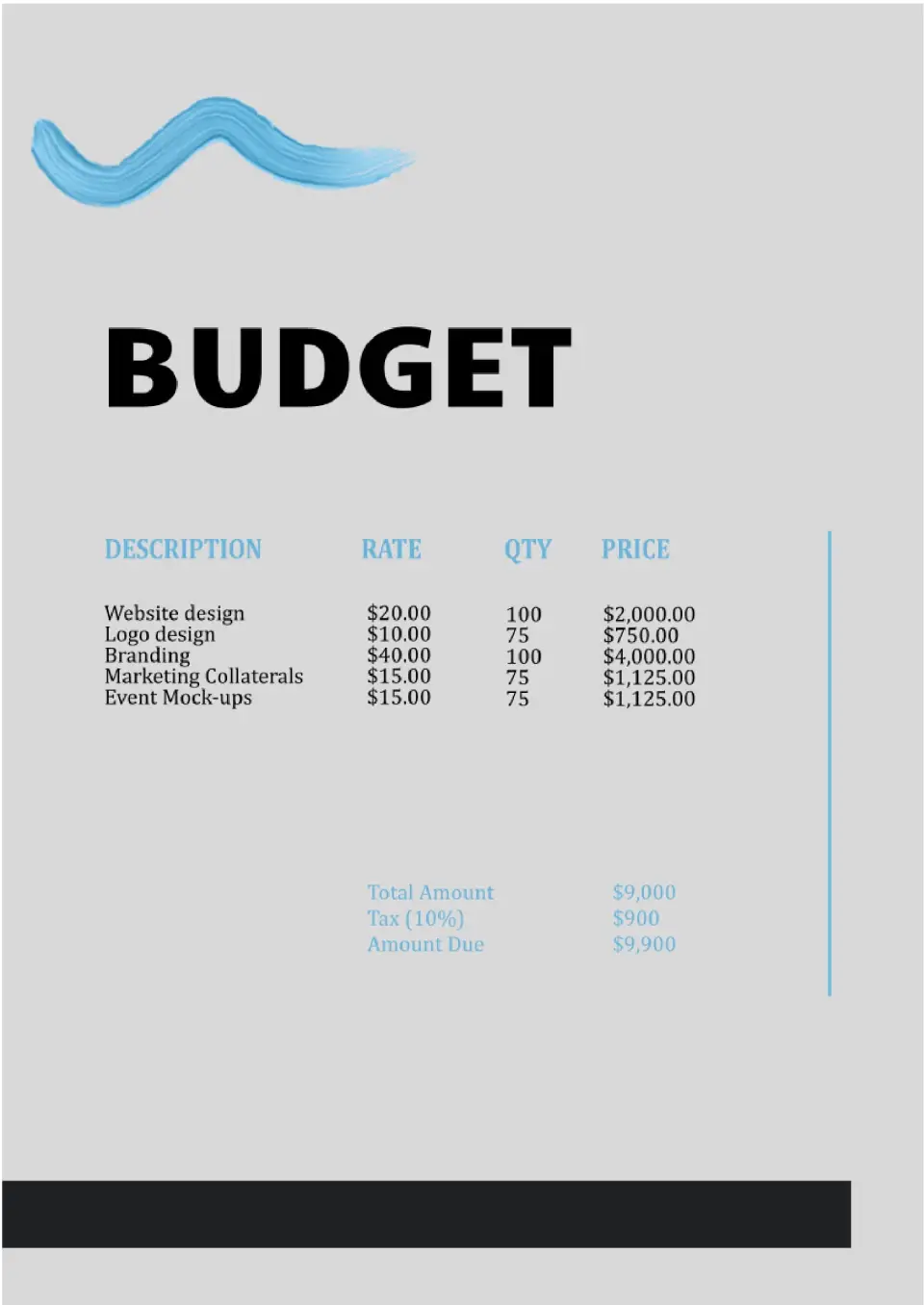 A solid budget template for your business. You can edit the list of services provided to the client, specify the price and quantity, calculate the total cost, tax, and balance due. Indicate the title, brief description of the project, company details, and payment information and provide the ready-made budget plan to your clients. Like all the free templates for Google Docs in our gallery, it can be downloaded and printed.