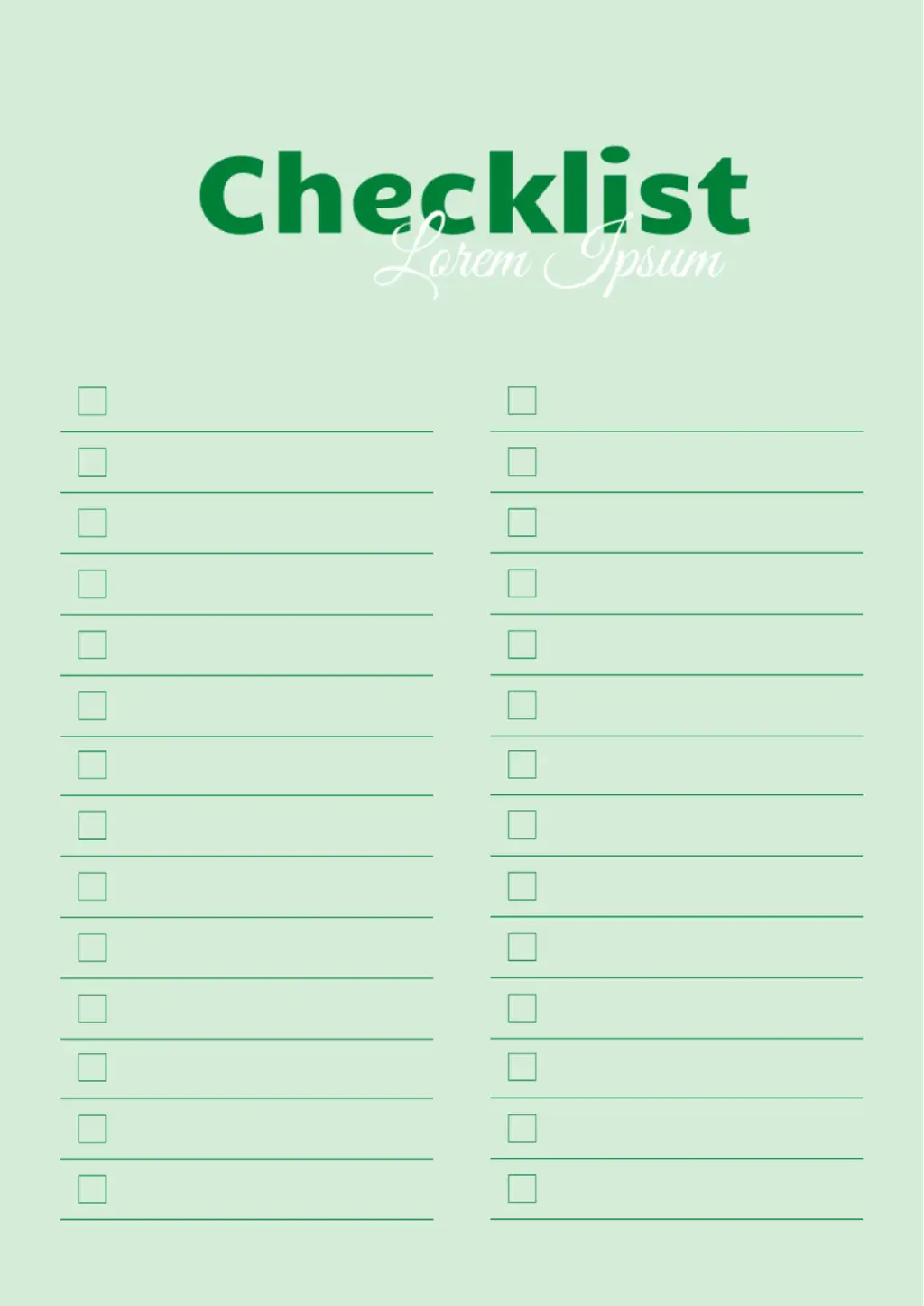 This broad-based template is suitable for creating any checklist. The name is indicated at the top, and below the sheet is divided into two columns, which list specific cases. Each line has a small checkbox. In the editing process, you can replace the green color range, and then fill out the template online or print it for added convenience.