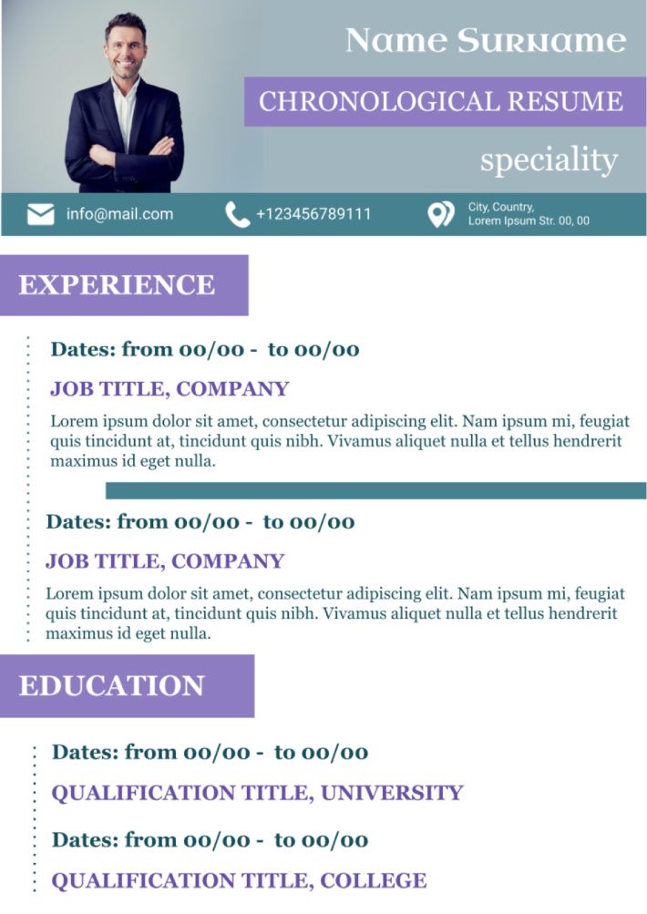 This approach is especially significant when it comes to specialists with long professional experience. The use of chronological resume template for Google Docs includes all obligatory details for the development of the CV of high quality involving: