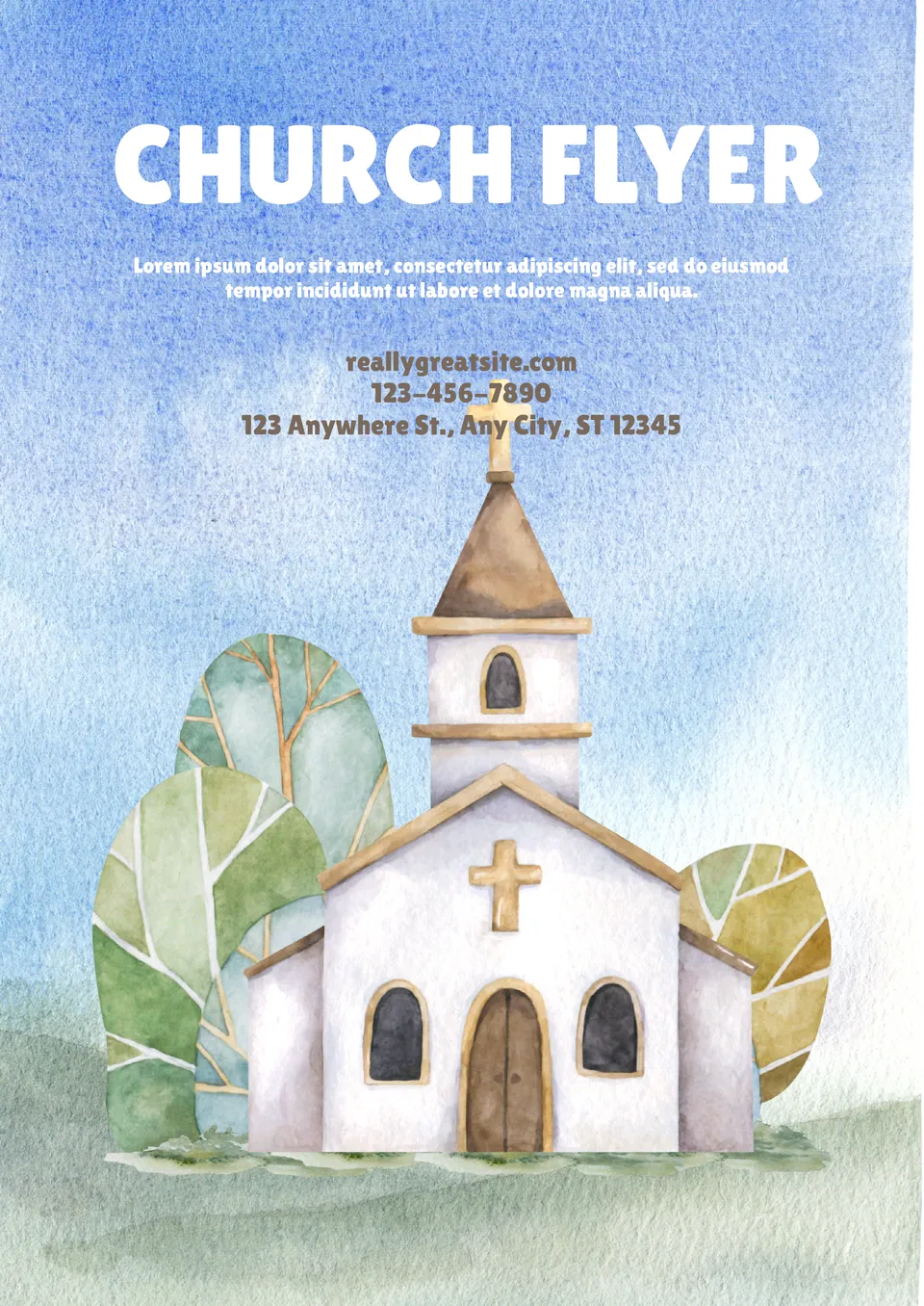 The Church Flyer Template for Google Docs will help you to unobtrusively remind your parishioners about Sunday service, announce a prayer meeting, and invite them to a festive sermon. The soothing blue background and beautifully painted church set a peaceful mood, making you want to visit the temple of God. Add all the information about the upcoming event to the top of the template flyer, then print the flyers or send them to your parishioners online.