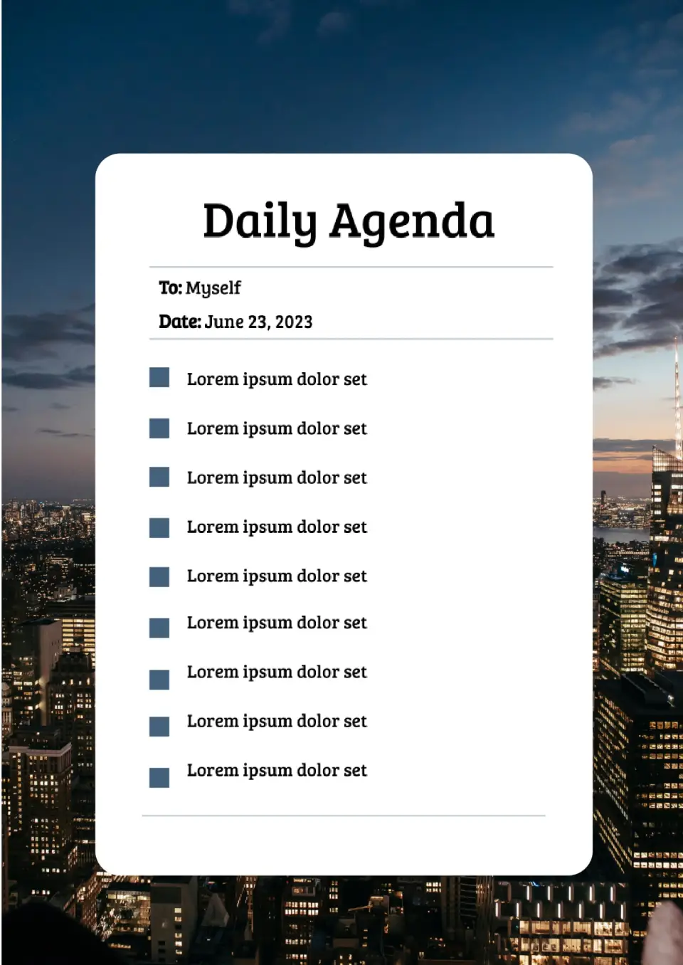 With a beautiful background in blue tones, this template looks very smart. The information is structured in an offbeat way: next to the description of each item there is a column with a bulleted list where you can show goals or theses.