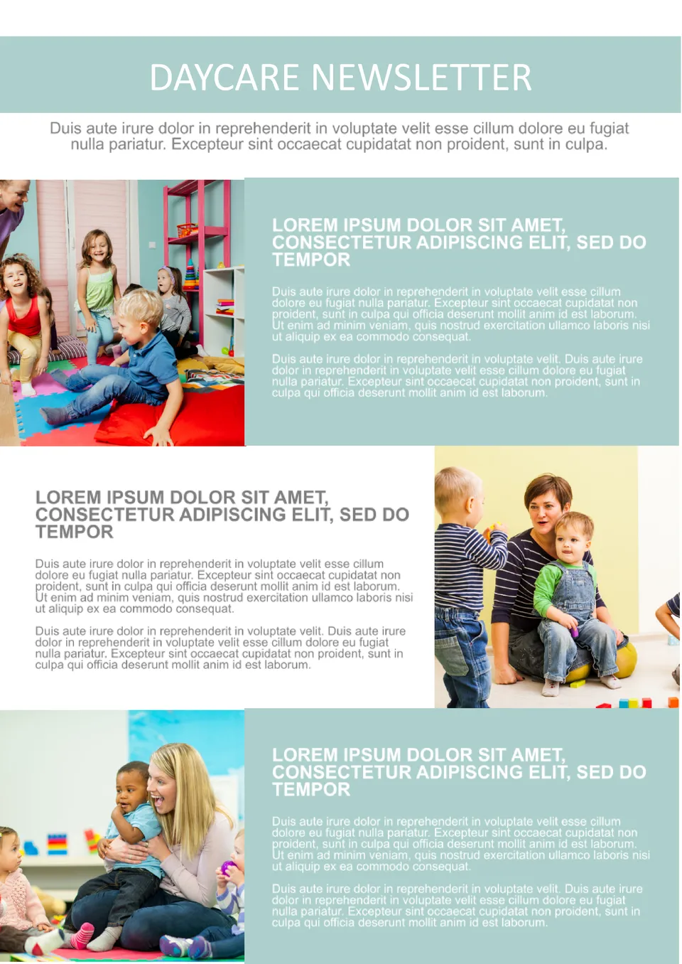 Keep parents informed about important updates and upcoming activities with the Daycare Newsletter Template. This template is designed to help daycare centers share essential information, from lesson plans and special events to health guidelines and parent reminders. Customizable sections allow you to include photos, schedules, and daily highlights, making it an effective communication tool that fosters trust and engagement with families.