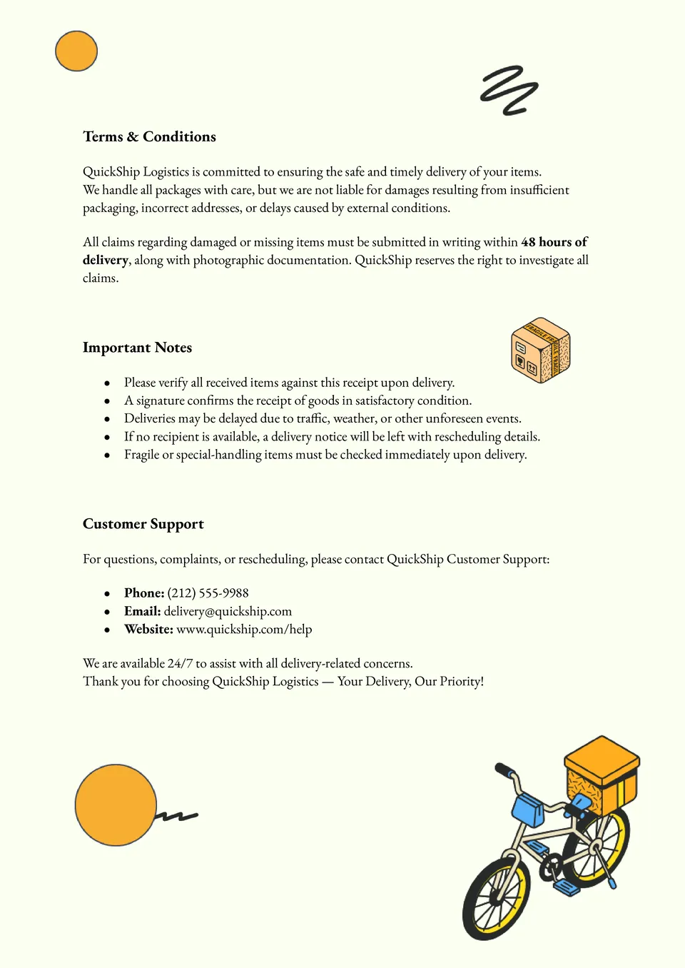 Simplify your delivery receipt documentation with the Delivery Receipt Template. Ideal for courier companies, online stores, or food establishments, the template guarantees all shipments to be documented with the necessary information such as items received, number of items, signature of recipient, and date of delivery. The template's professional format minimizes mistakes and makes tracking simpler than before. The Delivery Receipt Template ensures you remain efficient and keep accurate records for you and for your customers.