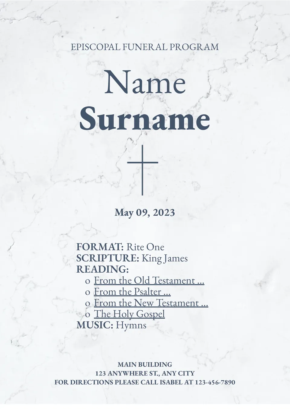 The background of this editable template is stylized to resemble marble. In addition to information about the burial site, you can specify the names of prayers and hymns that will be sung during the service. The text in this funeral program is center-aligned. Fonts of different sizes are used to highlight the most important information for readers.