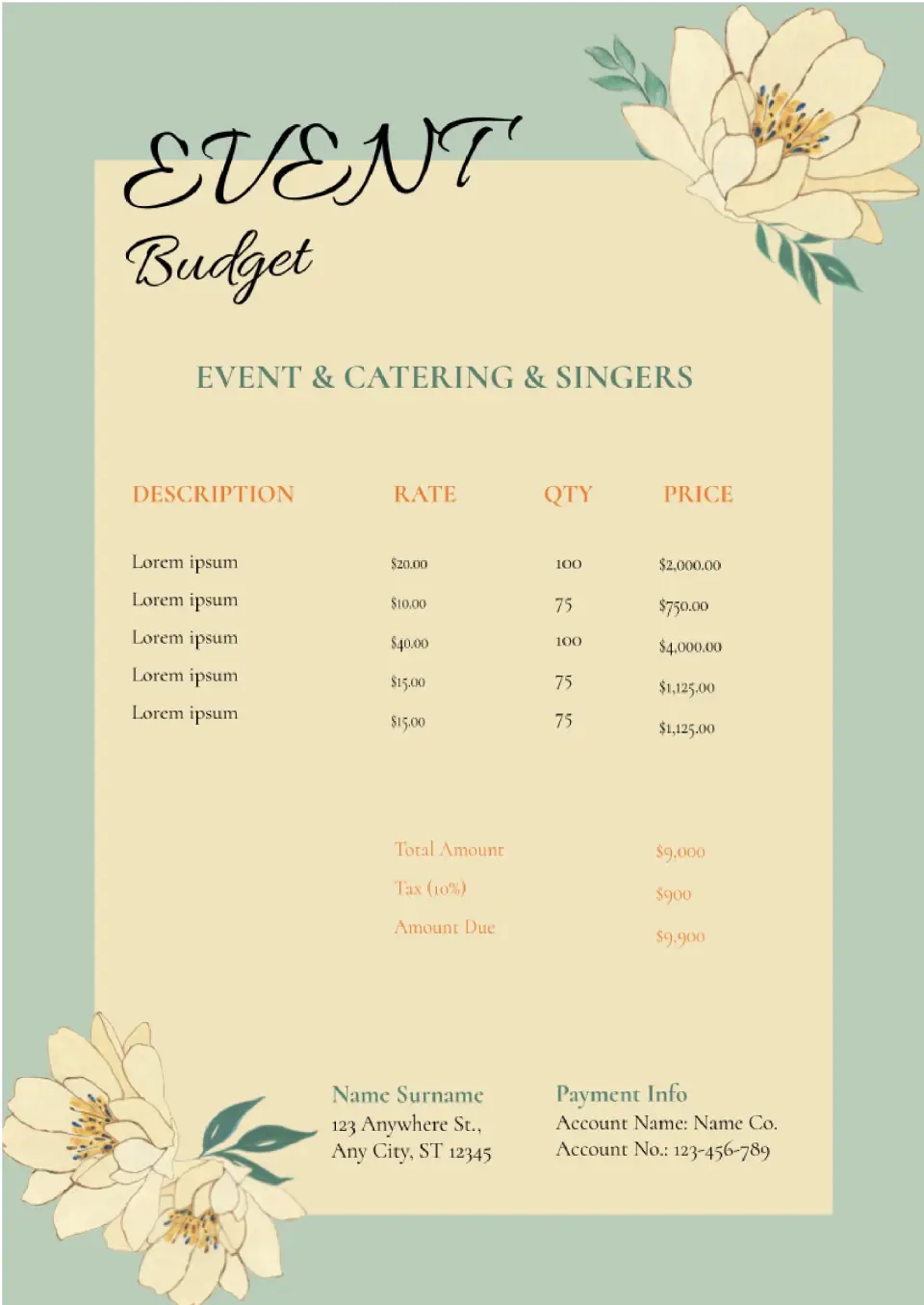The template is designed by a designer specifically for budgeting events and various activities. You can specify expenses related to banqueting, entertainment programs, and service. Quickly enter into the layout the list of ordered, quantity, and price and use it immediately. Download the budget template with a floral design and get a business tool that will highlight your unique style.