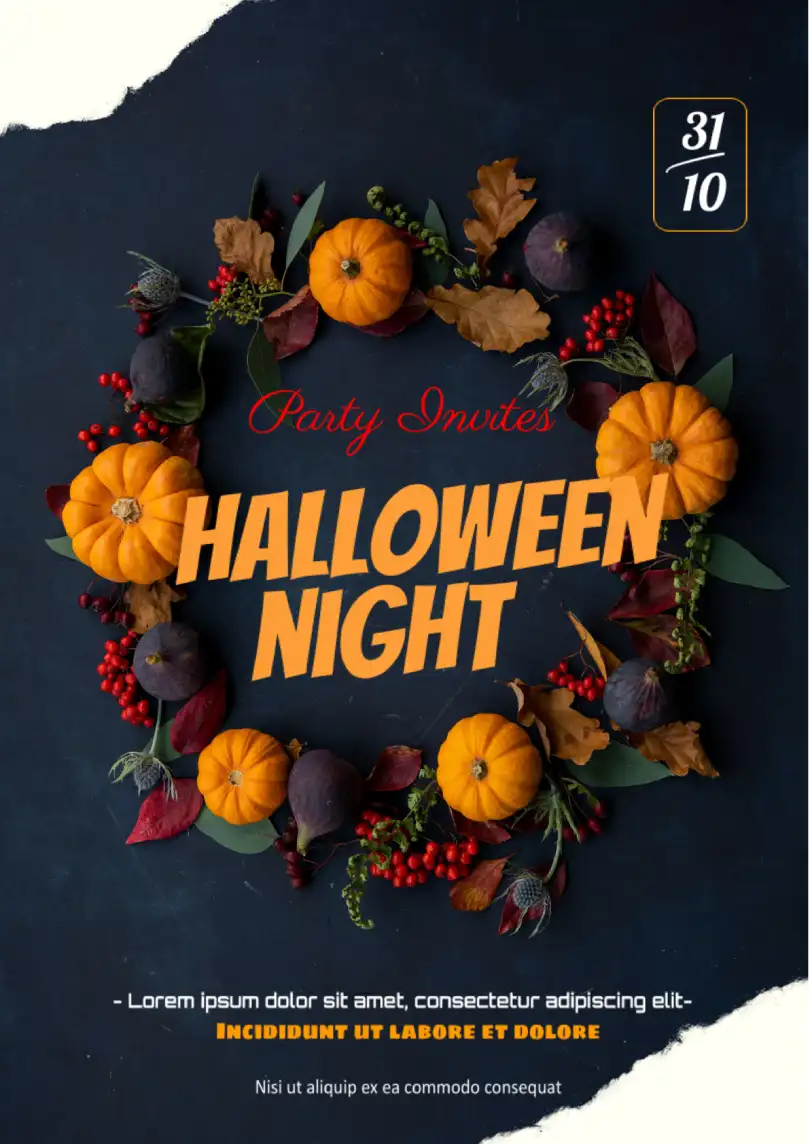 Are you going to organize a Halloween party but don't want your invitations to be too spooky? Then this elegant layout in the traditional black and orange color scheme will be perfect for you. Most of the free flyer template is occupied by an atmospheric image of a wreath with pumpkins. In the center, you need to write the theme of the party, and below it, specify the start time, address, contact details, and other important information for the guests.