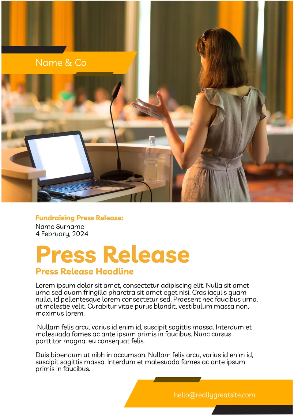 Involve the community in current issues - use the printable Fundraising Press Release Template with orange headlines. Specify the purpose of the fundraiser and tell about the event dedicated to it. Download, edit the text and get a ready-made layout for the media. Choose from the gallery of free templates for Google Docs used by charitable and non-profit organizations.
