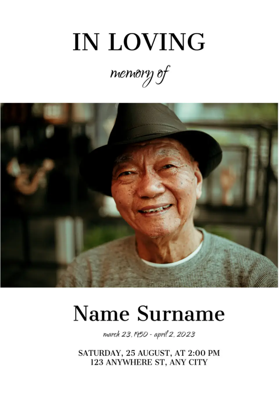 The Universal Funeral Program Template for Google Docs is suitable for representatives of all religious denominations. You can place a photo of the deceased in the center. Below, the full name, years of life, place, and time of burial are indicated. The funeral program templates have different types of fonts for the text to make the information easy to read.