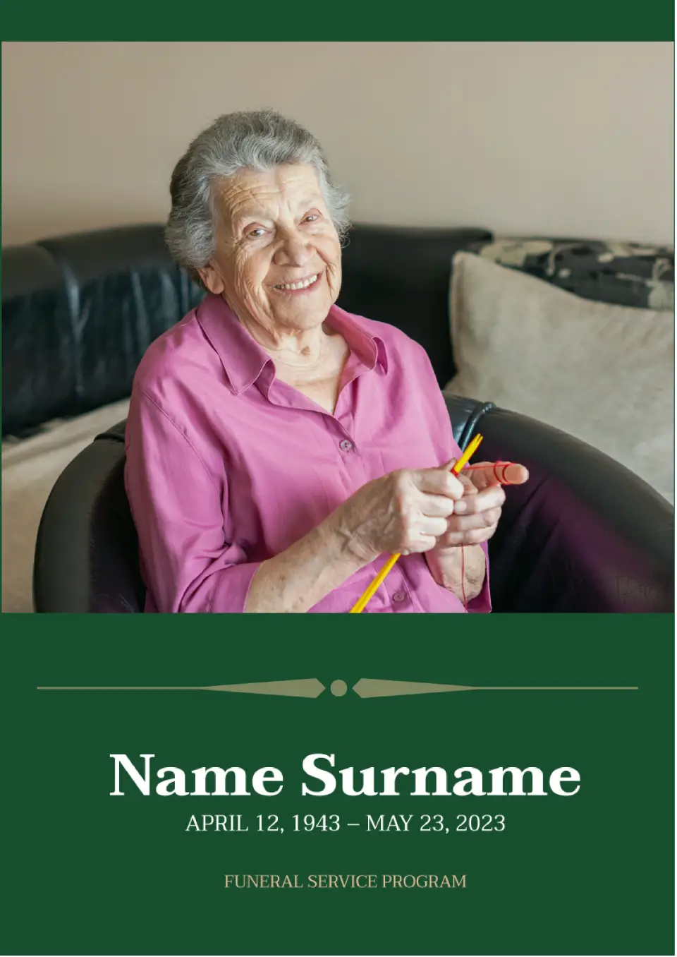 Use this template to inform friends, relatives, and acquaintances of the deceased about the date of the burial ceremony. A large photo occupies most of the page, with text in white placed below on a green background. The card is particularly suitable for electronic distribution. If desired, the colors can be quickly edited in Google Docs.