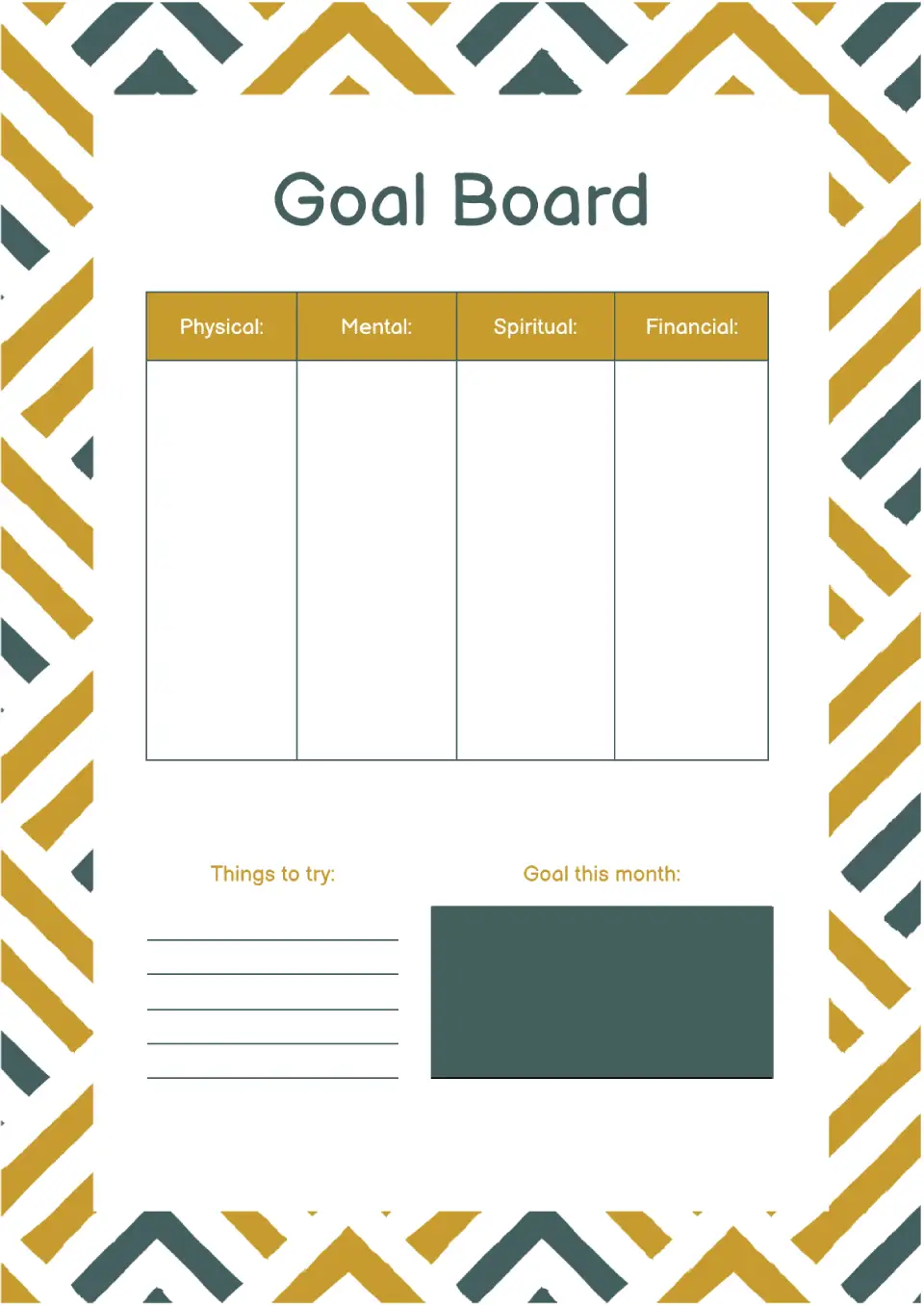 Plan your development comprehensively with this original template. Most of the sheet is occupied by four columns where you should write down your physical, mental, spiritual, and financial goals. There are two interesting blocks at the bottom: things to try and this month's goal. The layout also stands out among other templates because of its original frame.