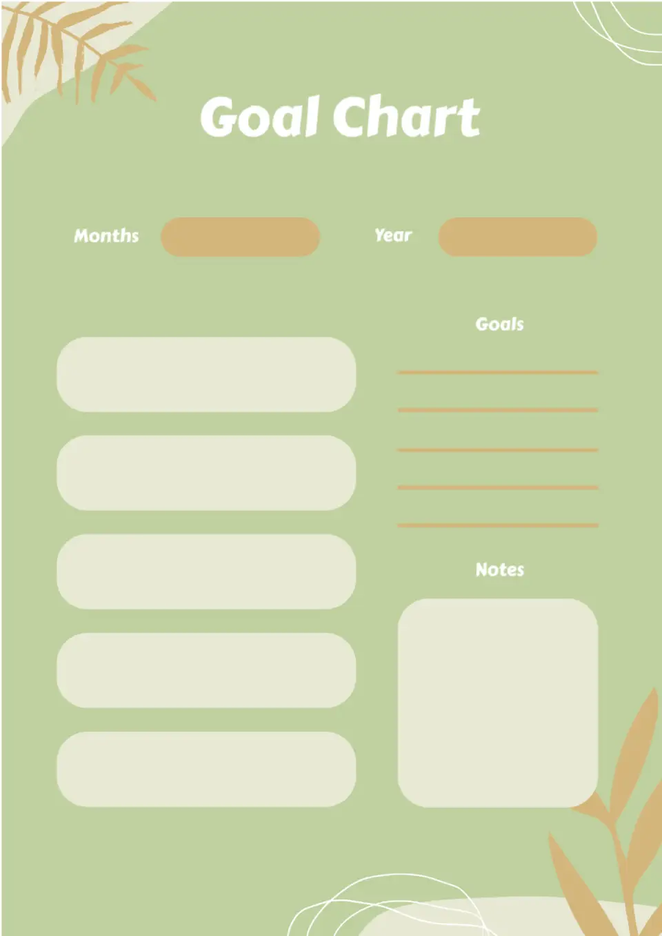 The original Goal Chart Template for Google Docs is perfect for those who like to visualize their dreams, goals, and plans. You can add not only text, but also images, diagrams, and drawings to the empty boxes. The neutral background with floral elements makes this editable Google Docs goals templates suitable for any purpose.