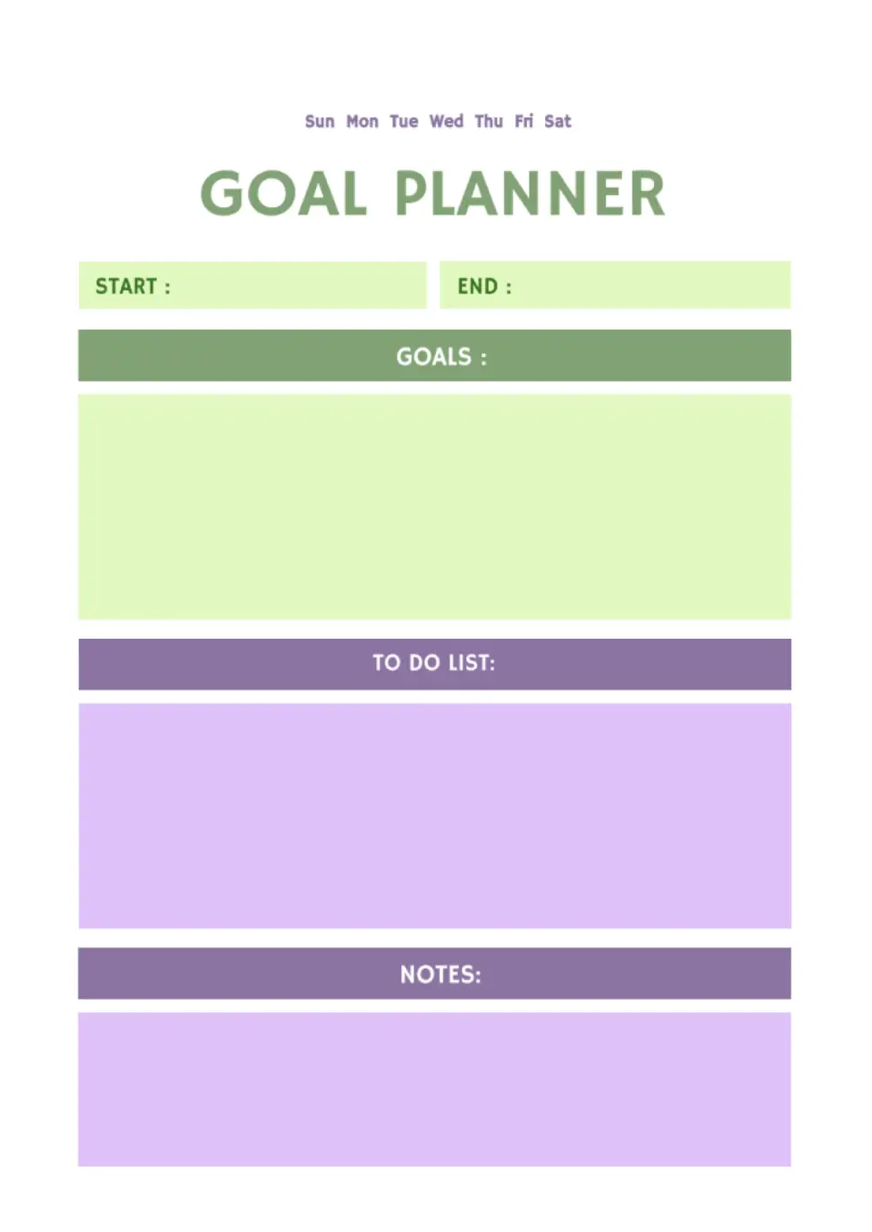 Visually, the layout is divided into blocks for text of different colors. In the upper ones, you need to specify the goal, the moment you start working on it, and the date by which you plan to finish. Below, there is a space for a detailed to-do list and notes. If you wish, you can quickly change the green and purple color palette of the goals template during editing.