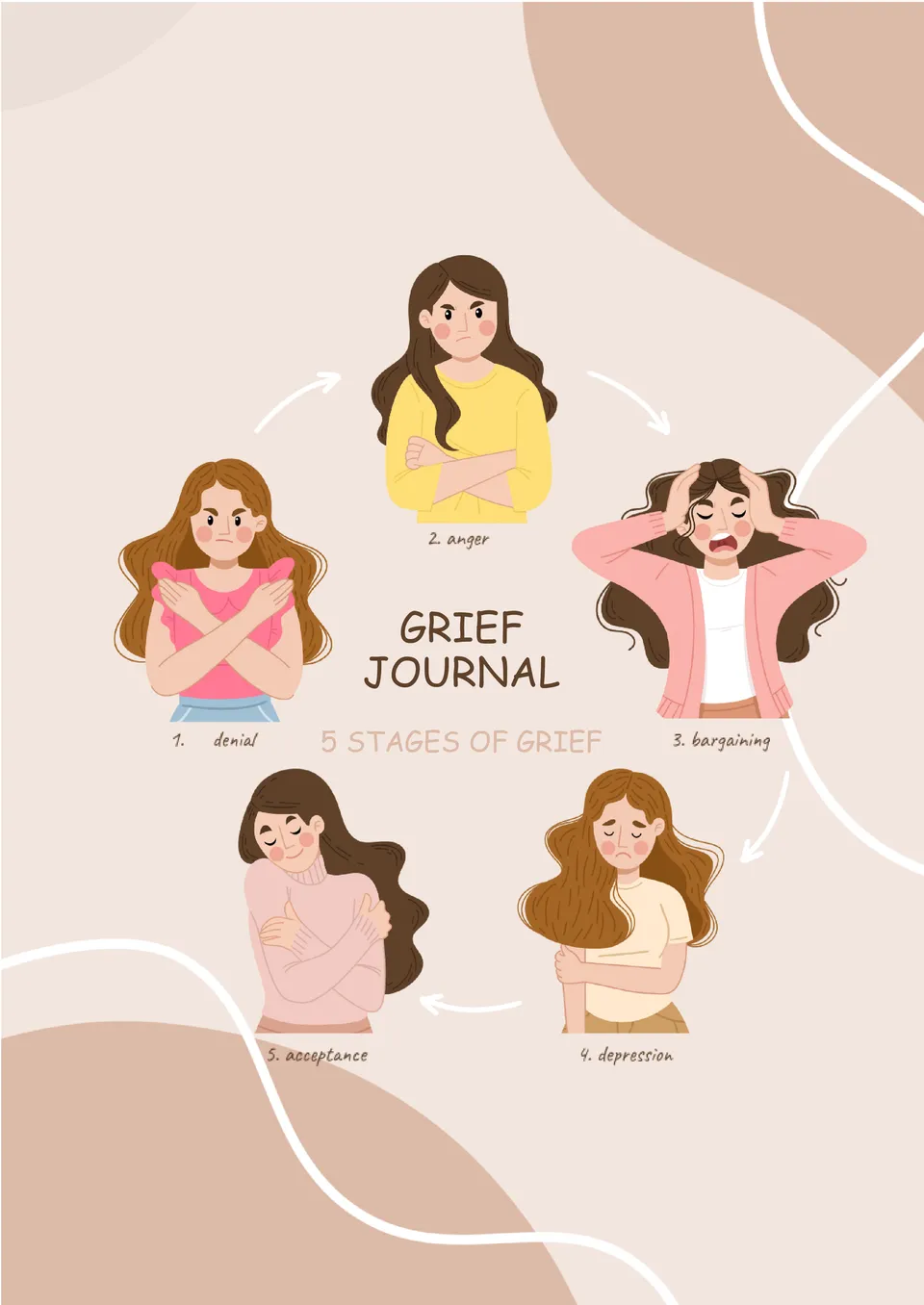 This unusual template will help you get through an unpleasant moment in your life faster. It contains a list of 5 stages of grief from denial to acceptance along with thematic illustrations. Talented drawings on a neutral background will remind you that the emotions you are experiencing now are normal, so you don't need to beat yourself up for being angry or in a bad mood. Writing down your own experiences in a journal template will make it easier for you to let go of the situation.