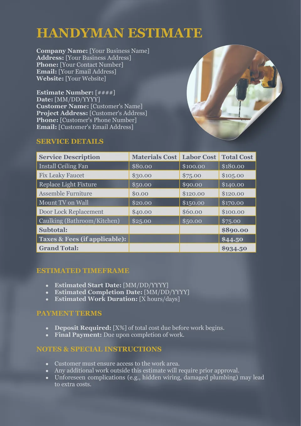 Handyman Estimate Template