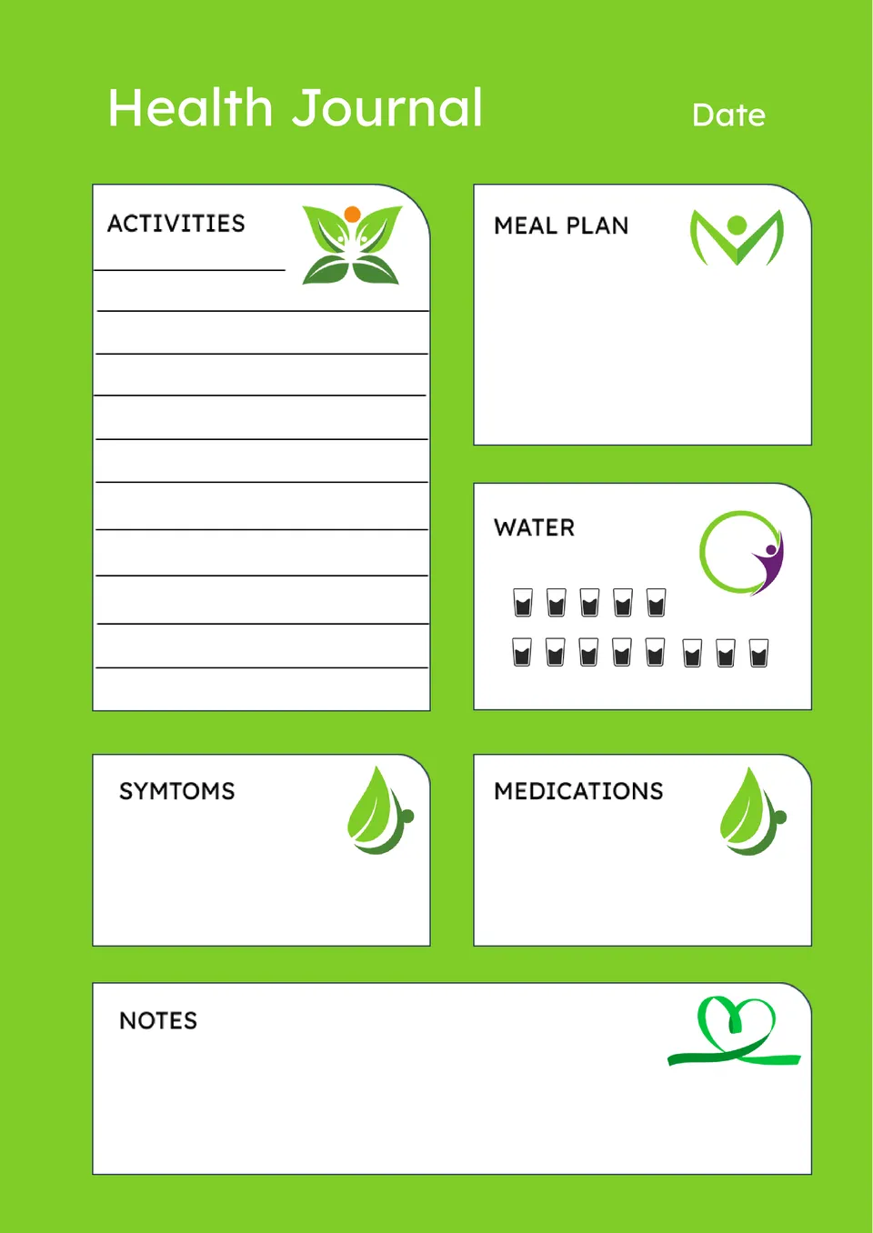 A bright template with a pleasing green background will help you take good care of your health. In the appropriate blocks, you need to enter your menu for the day, planned activities, health, and medications to be taken. Special attention in the Health Journal Template is paid to tracking the amount of alcohol consumed. There is a box with images of glasses that should be crossed out one by one after each drink of water.