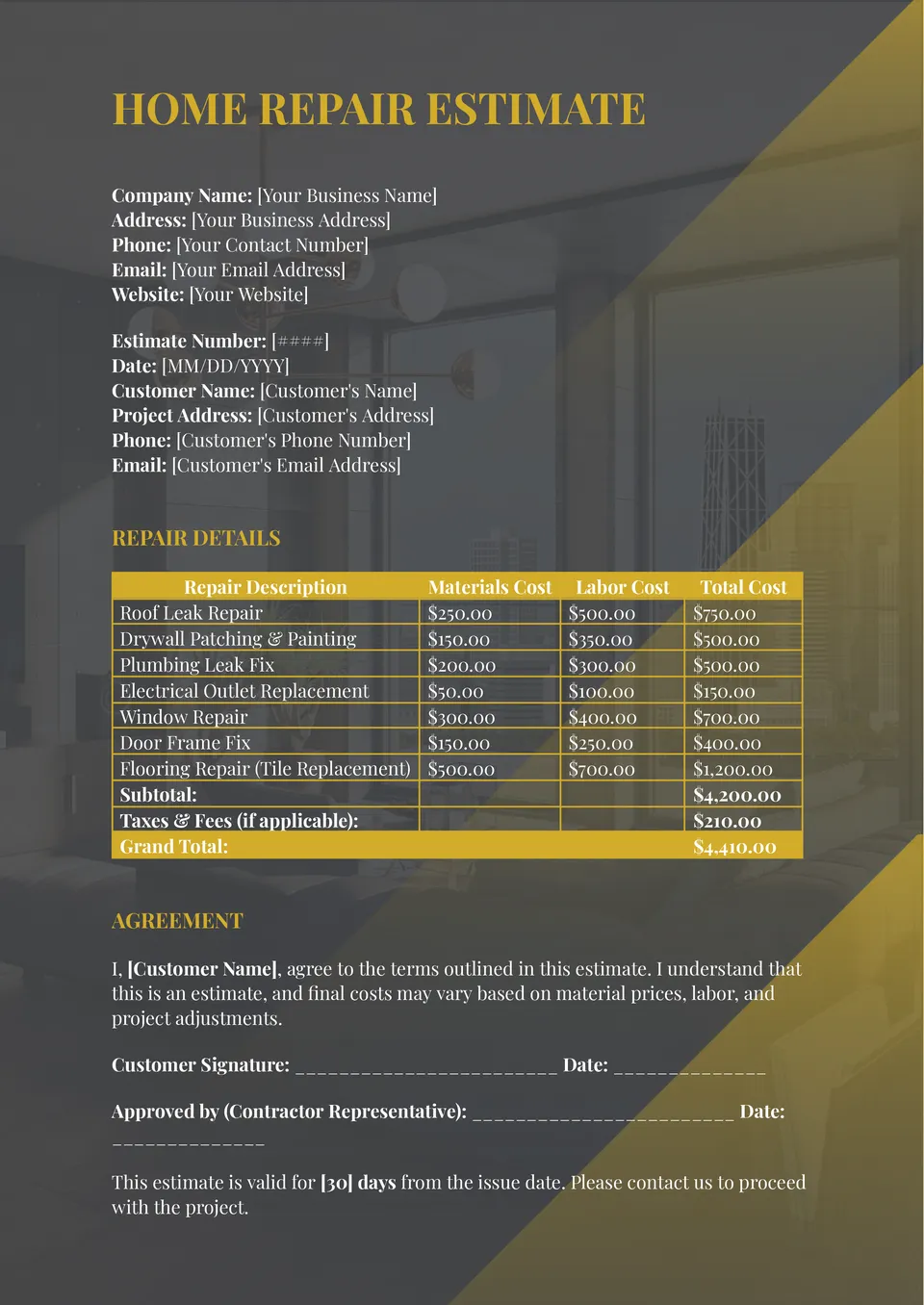 Are you a handyman seeking to offer clients accurate and detailed service estimates? Our Handyman Estimate Template is crafted to help you outline services, costs, and schedules effectively.