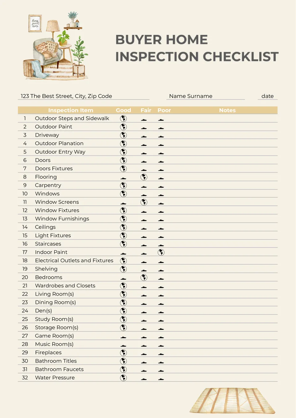 This versatile layout with a neutral beige background will be useful for those who are about to buy an apartment, house, or commercial property. It contains a 32-point list with all the important things to check in the property. Unlike other free checklist templates, there is not just one checkbox next to each line, but three at once: good, satisfactory, and bad. After assessing the condition of the object, you can write your thoughts about it in the wide right column.