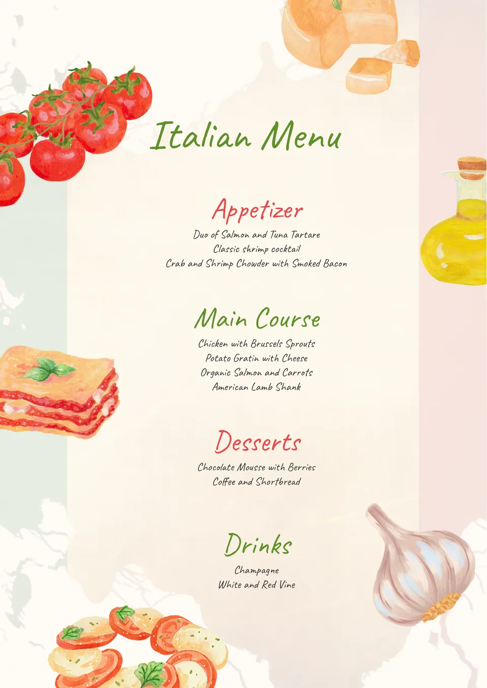Impress your customers with your Italian menu with this unusual template. The illustrations here are not photos, but drawings of lasagna, tomatoes, olive oil, and other foods traditional for the inhabitants of the peninsula. The pictures seem to be hand-drawn with paints, which makes this layout stand out among other menu templates. Dishes are listed in the center of the email in a sophisticated italic font. The category names are alternately made in green and red colors, traditional for Italy.