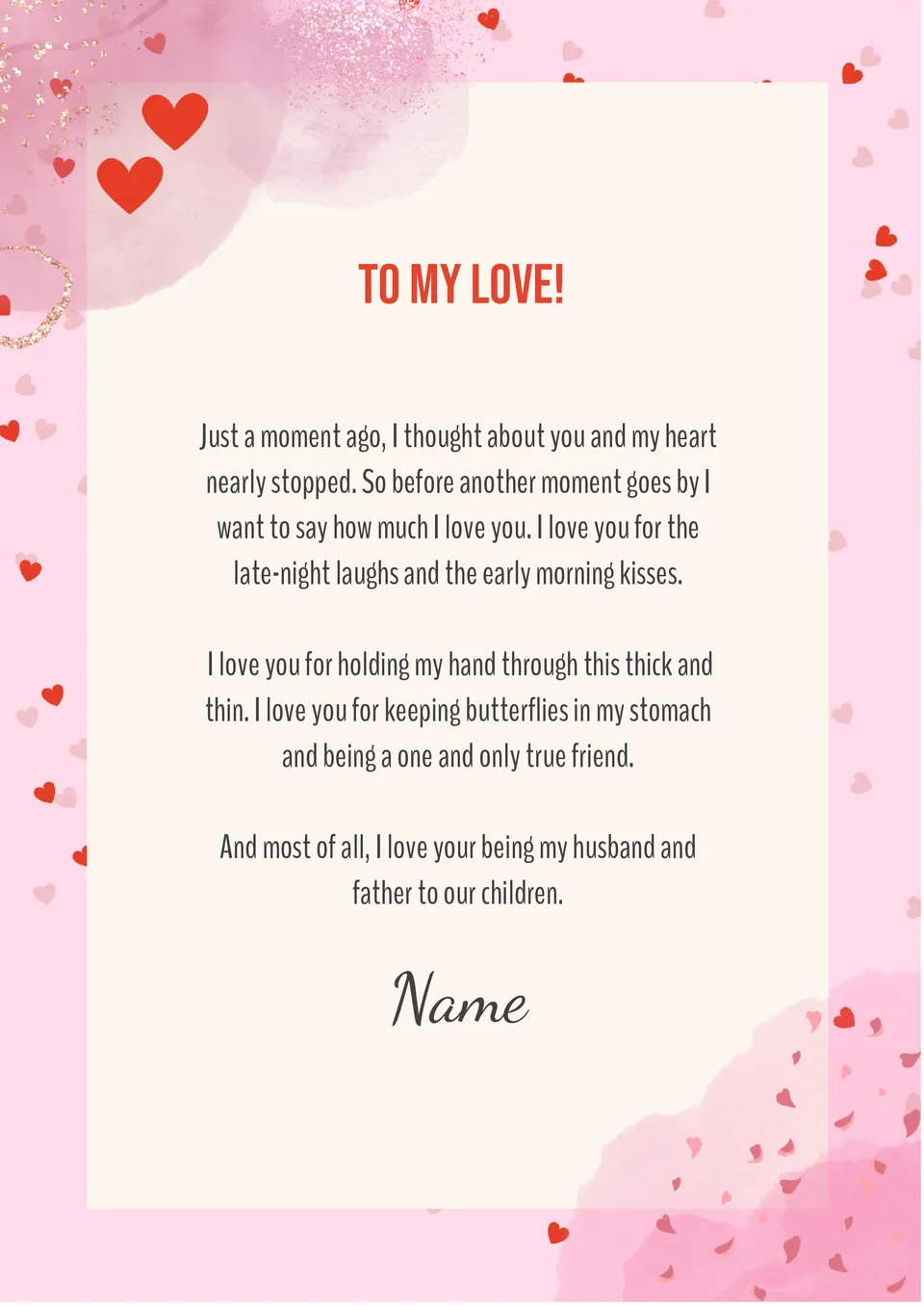 Have you ever sent a love letter to your loved one? Get started right now with the adorable Love Letter Template in Google Docs. If romantic descriptions of feelings aren't your strong suit, don't worry: the template already contains a ready-made touching love message. Add the name of your loved one, then print the letter template or send it online.