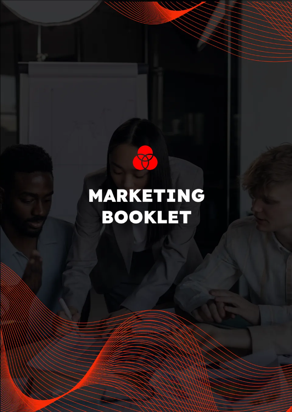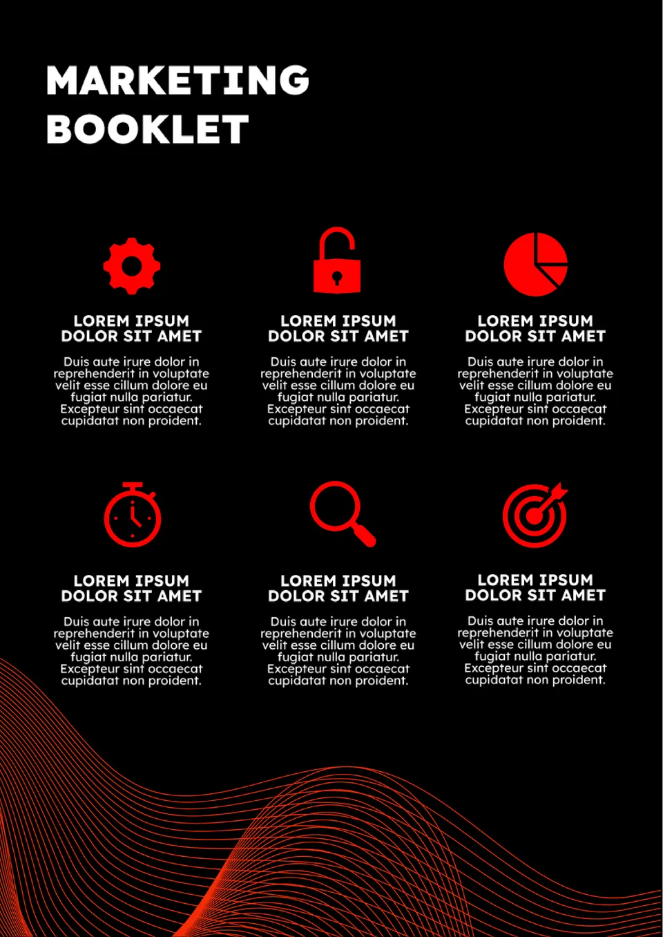 This stylish template will help you to showcase your company, products, and services in an effective way. The black background with red visual elements will emphasize the modernity and innovation of your brand. This free booklet template includes two types of pages. The first one has a photo and a title. The second one consists of six text blocks decorated with schematic illustrations. All you have to do is add your information to these columns.