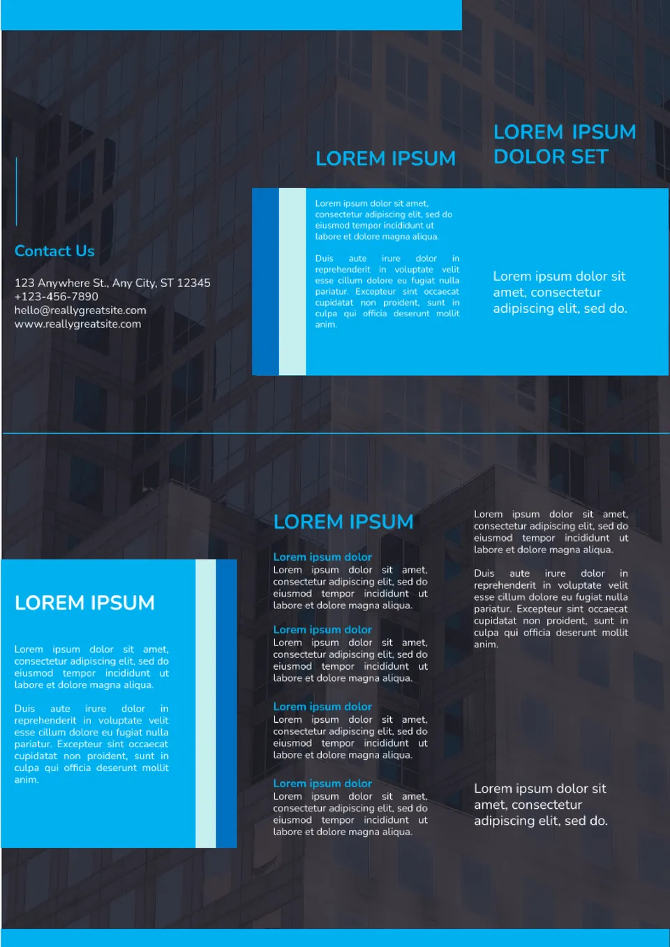 The template is designed to create a horizontal A5 brochure. It includes two types of pages, each of which is visually divided into three parts. If you wish, you can fold the sheet twice, making it a compact booklet. This free Brochure template has a lot of space for text, so it will be well suited for a company presentation.