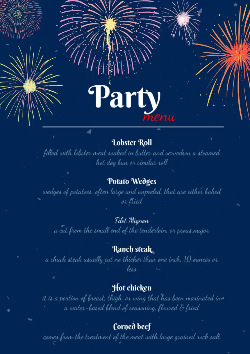An individual style of holding and organizing a corporate party is selected to make the holiday memorable. Organization of theme parties for large companies is very important. In this case, the use of the party menu template for Google Docs is a necessary detail to have time to complete all the preparations. The menu can include such details as: