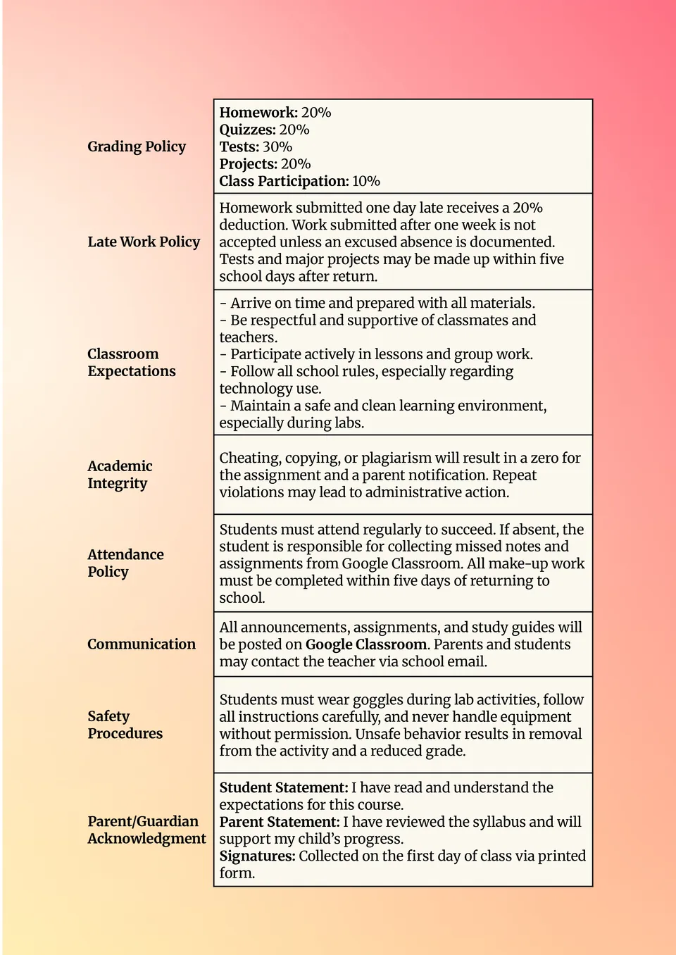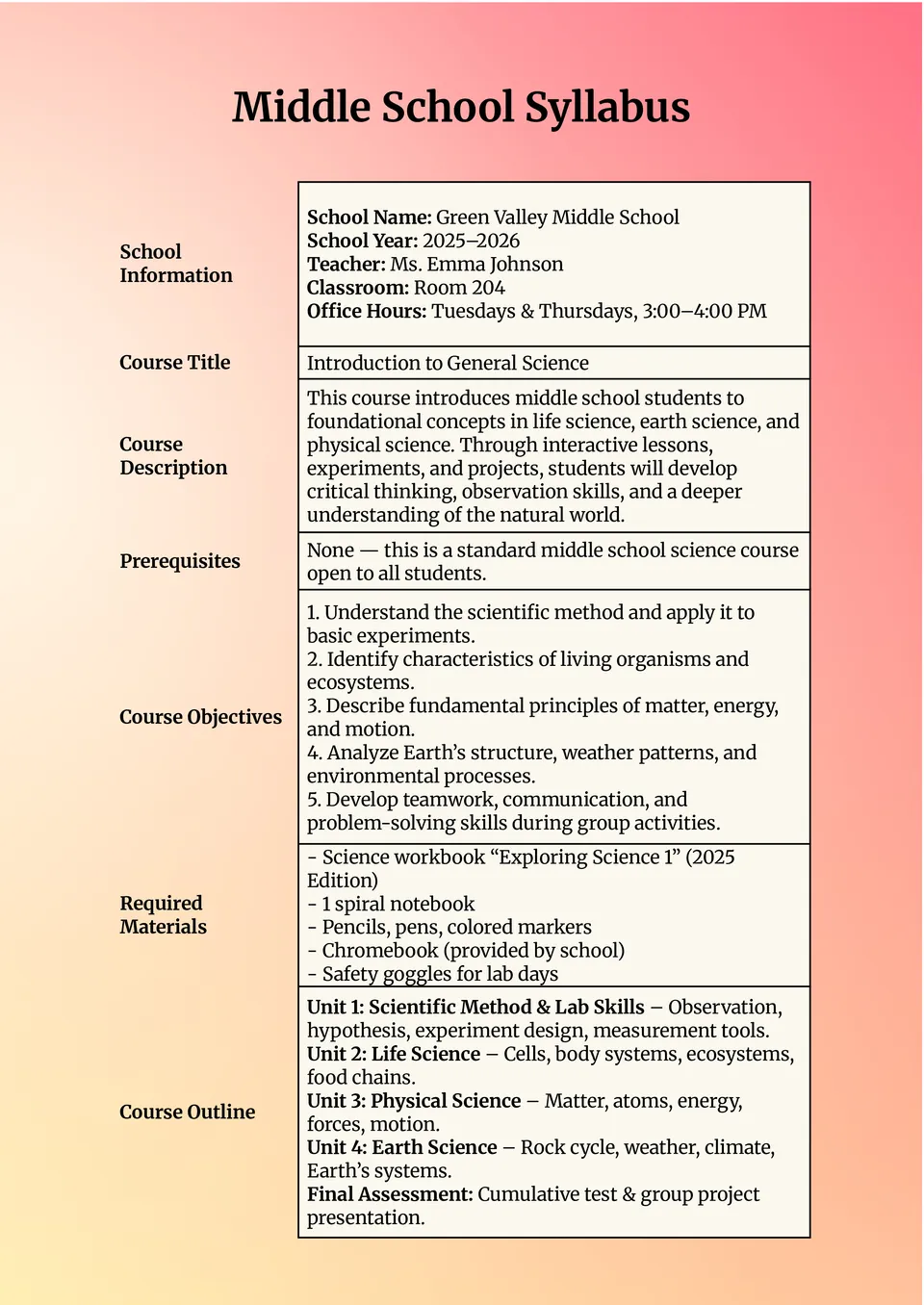 Middle School Syllabus Template