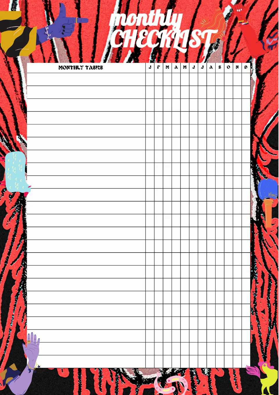 The stylish Monthly Checklist Template for Google Docs will help you plan your year effectively. It looks like a tablet with twelve columns with checkboxes, each of which corresponds to a different month. The highlight of the layout is a frame in red and black colors decorated with colorful illustrations. You can print the template or use it only electronically, recording your progress online.