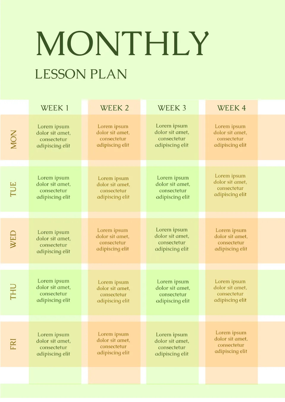 Want to create a monthly lesson plan? This printable Google Docs lesson plan template will suit best. In special cells, you can indicate the topics of upcoming lessons and even make short notes with important information. If necessary, the page can be duplicated to create a monthly plan for the entire semester.
