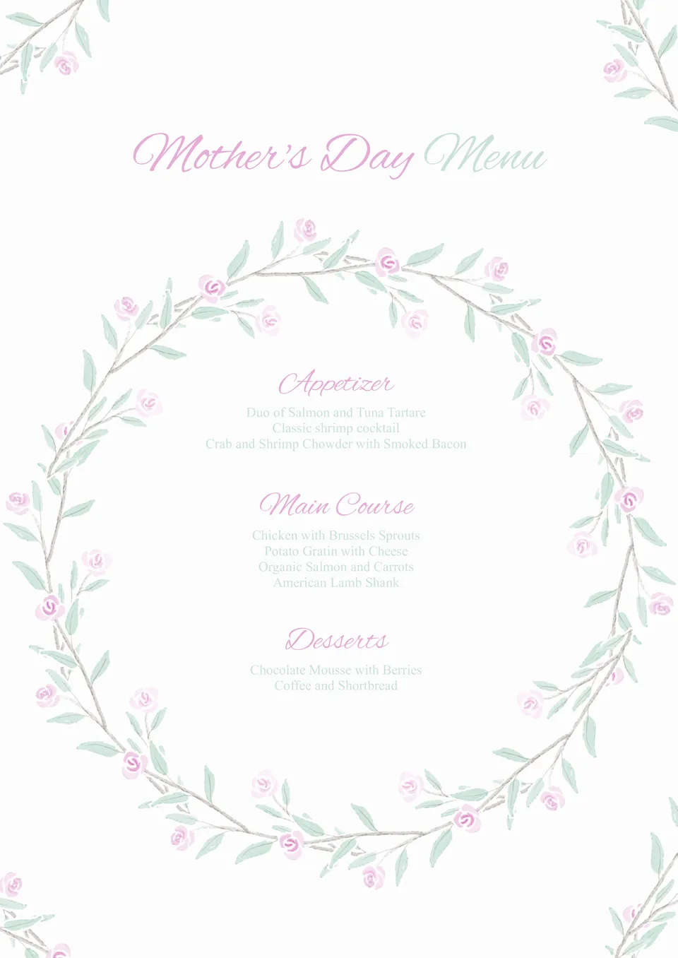 Make your Mother's Day menu truly unique by using this themed template. The delicate color palette and elegant design will surely appeal to your customers. The highlight of the Google Docs template is the images of flowers that look like they were drawn by hand with pencils. Print the layout on matte paper to preserve its fascinating look.