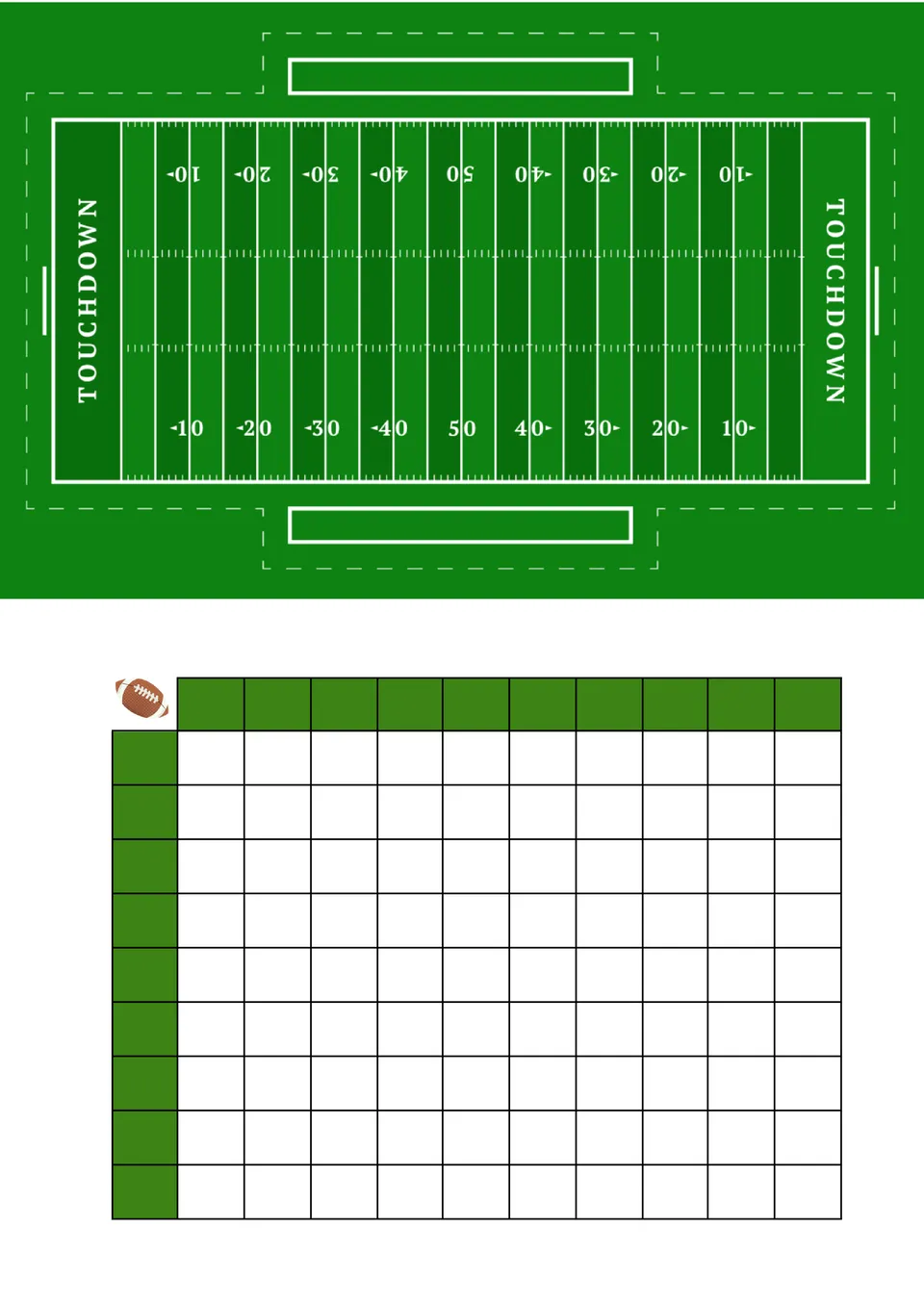The standout feature of the Numbered Super Bowl Squares Template is the image of a green football field at the top. The same color highlights the first horizontal and vertical row of the square block. Overall, the design looks very stylish and harmonious. The Super Bowl squares template wonderfully conveys the atmosphere of an exciting football competition.