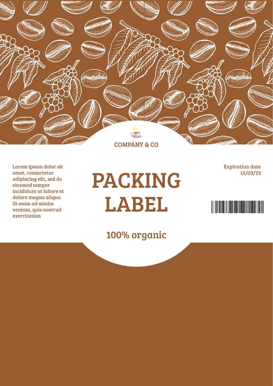 The themed Packaging Label Template for Google Docs is designed specifically for coffee-related products. You can use it to create a label for packaging with beans, aromatic additives, cosmetics, etc. Thematic images and brown and white color scheme create an atmosphere that will appeal to every coffee drinker. The product description is placed on the left side of the Label Template, and there is space for a barcode on the right.