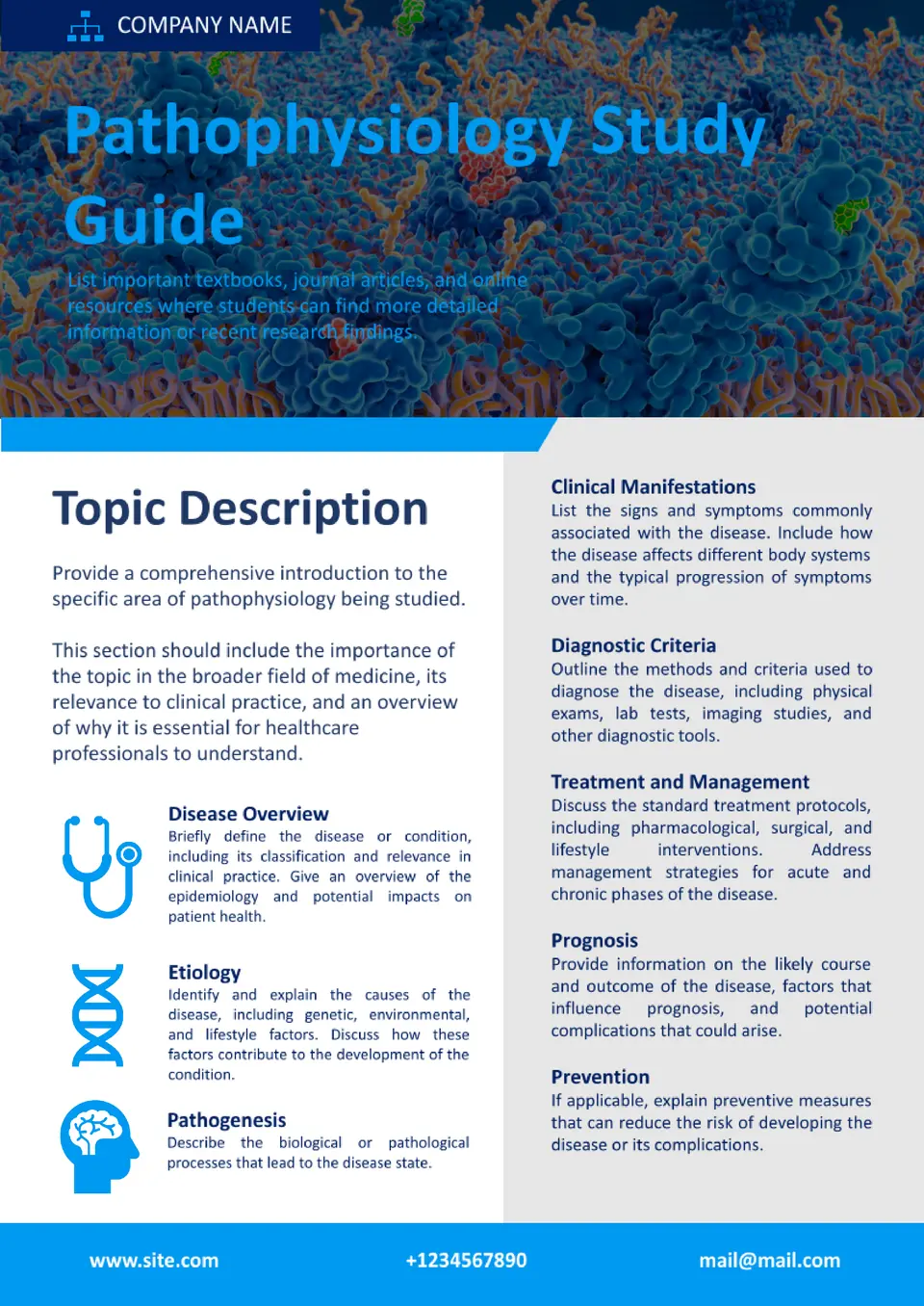 The Pathophysiology Study Guide is useful in medical education, research, or for personal use, and its design is thoughtful and practical, making it a useful tool for any medical practice. Download it now and see for yourself how much time you will save with Docs&Slides!