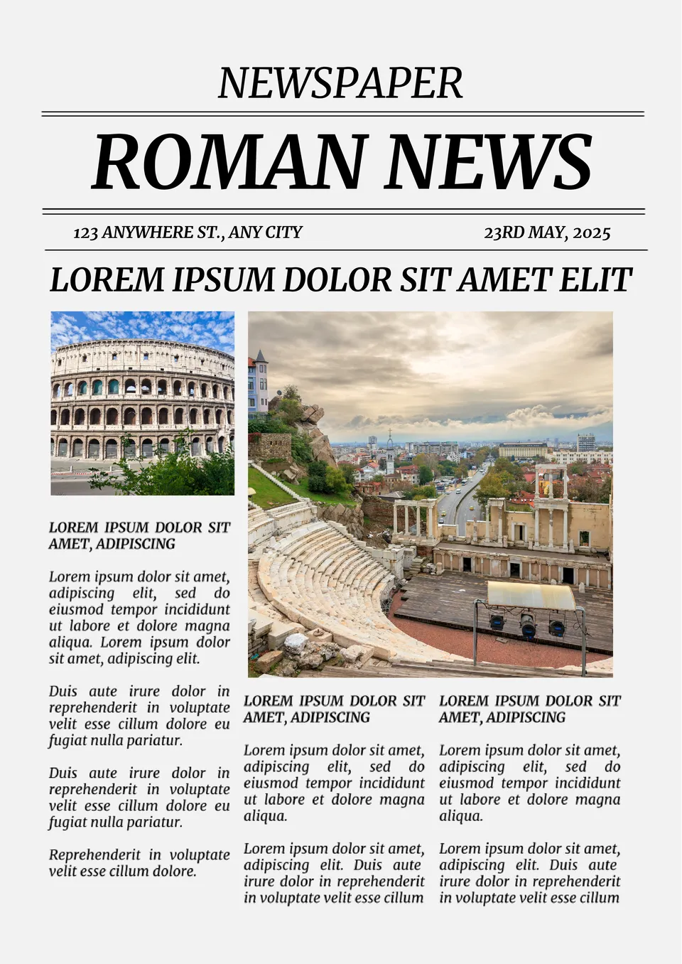 Roman Newspaper Template for Google Docs is specially designed to introduce readers to the life of a city. In addition to news, you can add information about architectural monuments, tourist attractions, interesting legends and customs. The text is divided into three columns, with enough space to tell about the most important things. The free newspaper template page will also accommodate several photos that will look great on a light gray background.