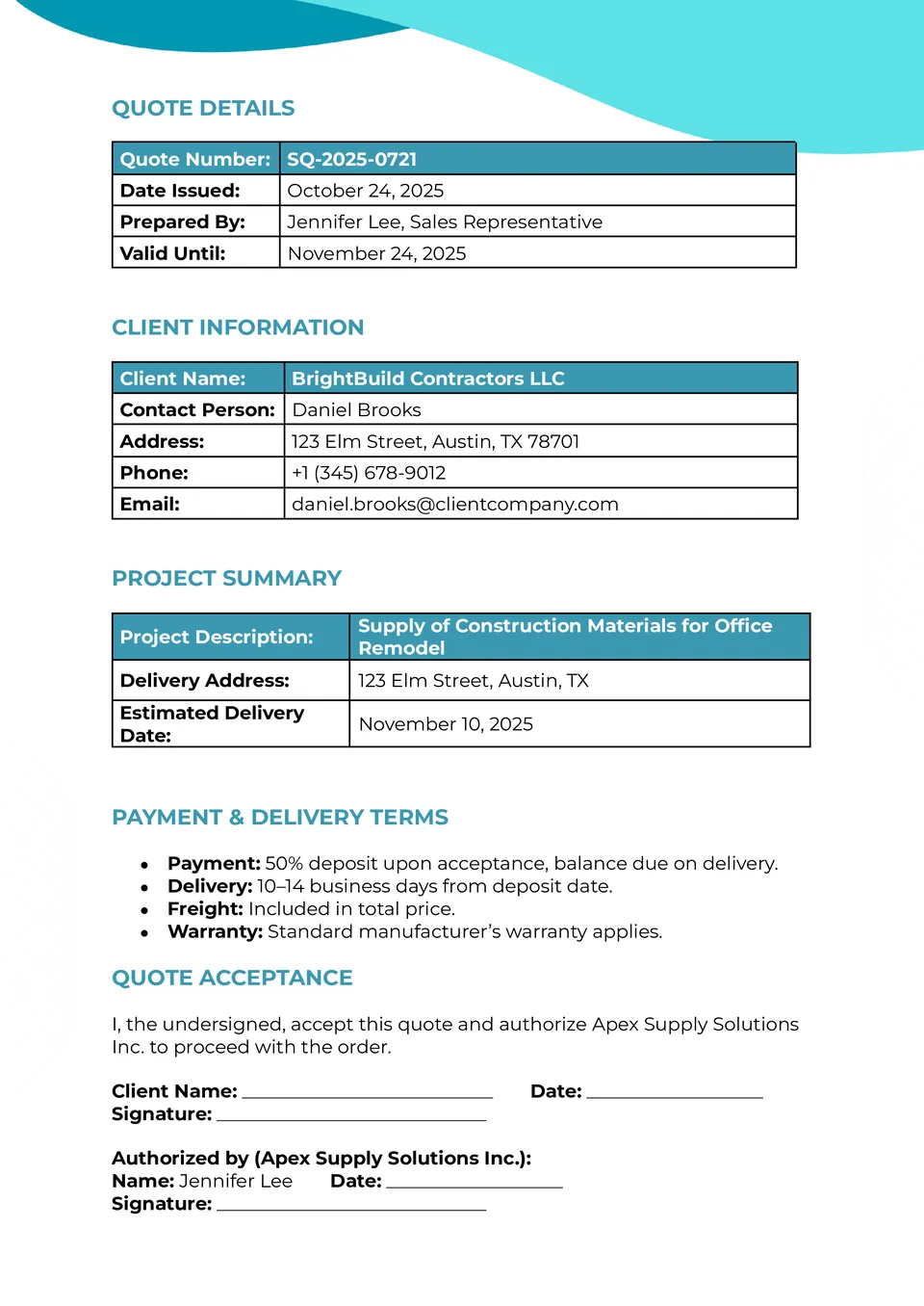 Want to deliver project estimates that look organized and credible? The Contractor Quote Template provides a ready-to-use format for scope, labor, materials, and pricing.