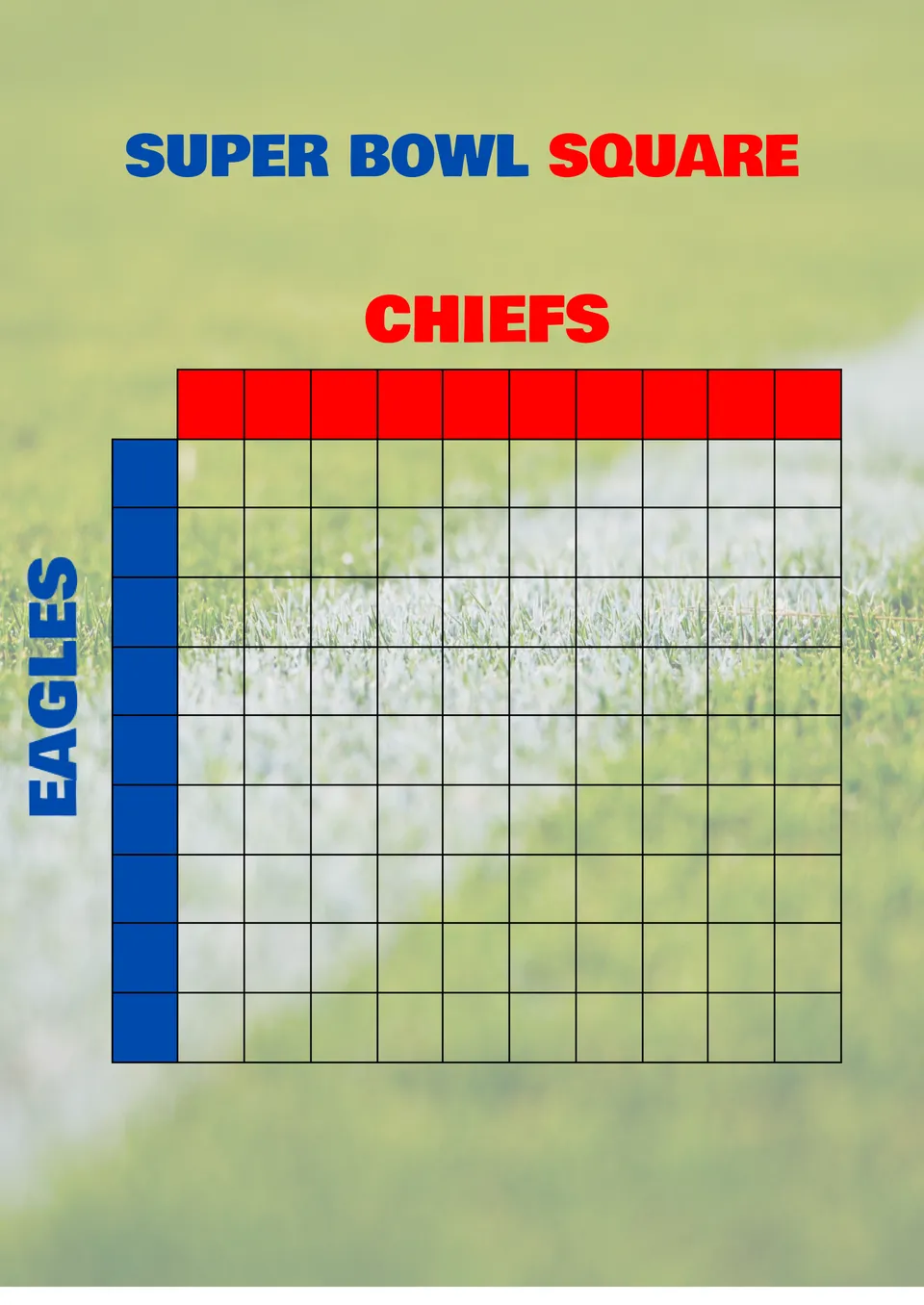 Use the Super Bowl Square Template to pleasantly surprise everyone who's planning to play along with you. A football field grass-like background sets a sporting mood. For convenience, the table is visually divided into two parts. The names of the 'red' and 'blue' teams can be changed when editing the Super Bowl squares templates.