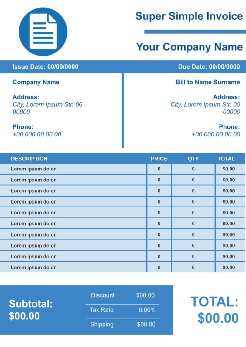 The minimum amount of detail and concentration on the main nuances represents a prerequisite for the organization of the productive working process. The same approach can increase the level of comprehensibility of any document. The super simple invoice template for Google Docs is a perfect format of the document involving only crucial points and significant details. The primary benefits of this type of the template implies: