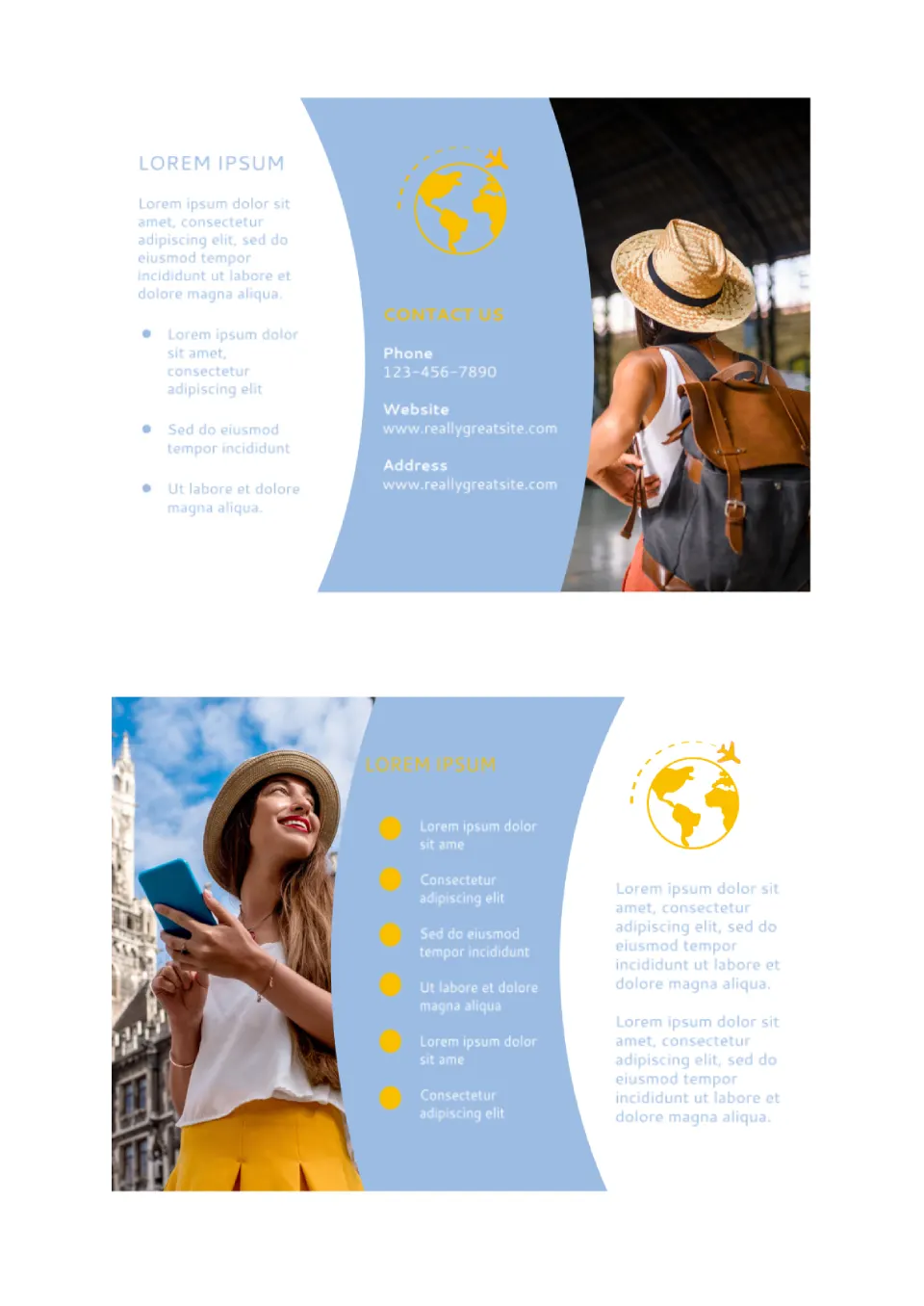This is a useful free layout for everyone who works in the tourism area. Due to this stylish booklet, you can perfectly advertise excursions, tours, trips. The template is visually divided into three parts, each of which has a place for a large photo. Short bulleted lists in the center look good on a bright background, and there is enough space in the text block for detailed information.