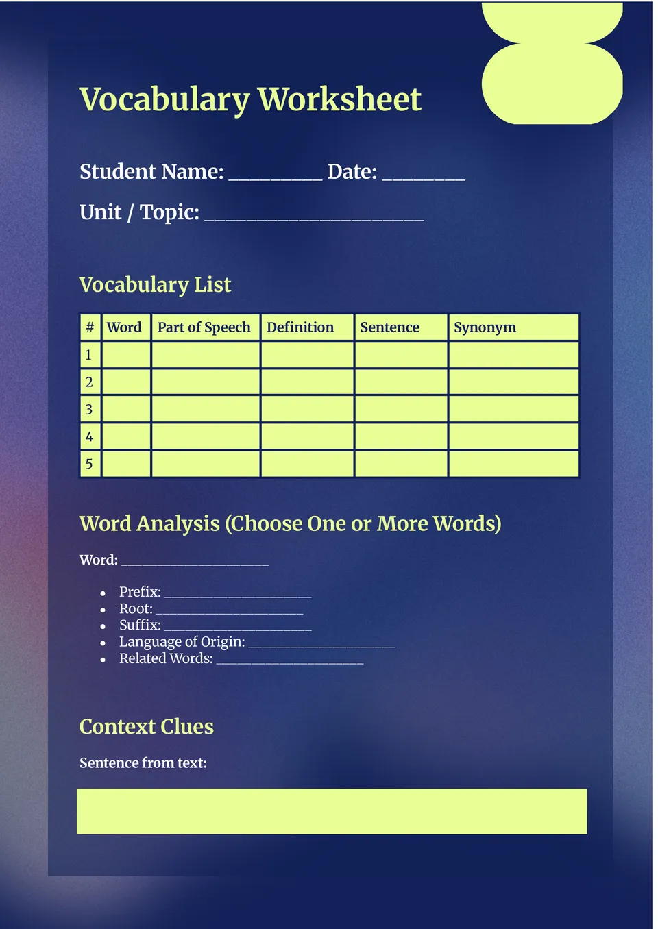 Vocabulary Worksheet Template